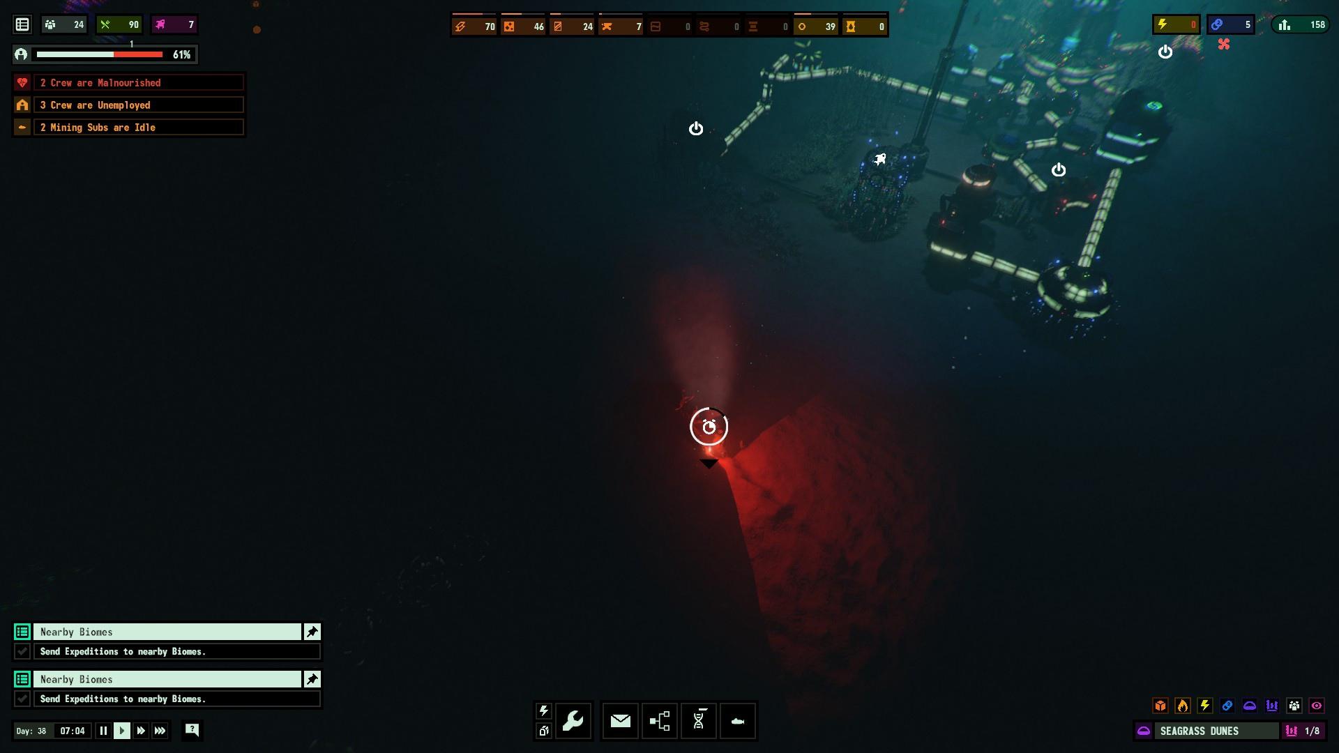 Во-первых, на любом этапе игры, кроме, быть может, самого старта и финала, игрока будет преследовать жёсткий дефицит ресурсов – как добываемых, так и генерирующихся внутри базы. Расширение базы и, соответственно, возможностей по добыче, предполагает строительство осветительного столба, пожирающего почти половину мощности угольного генератора энергии, к тому же, загрязняющего воздух и потребляющего много угля. Угольная шахта, в свою очередь, потребляет энергию и загрязняет воздух. Очистить воздух можно специальным генератором кислорода, потребляющим много энергии. И, разумеется, в каждом из этих зданий должен кто-то работать. По итогу каждую крупицу территории приходится буквально выгрызать у беспощадной тьмы.