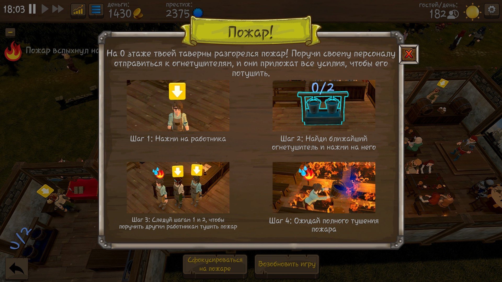 При возникновении пожара игра автоматический ставится на паузу и на экране появляется напоминание, как пожары следует тушить. Выбираете работников таверны и нажимаете на средство борьбы с возгоранием. После того как пожар потушен, если были уничтожены какие-либо предметы, вам будет предложено автоматически их восстановить за дублоны.
