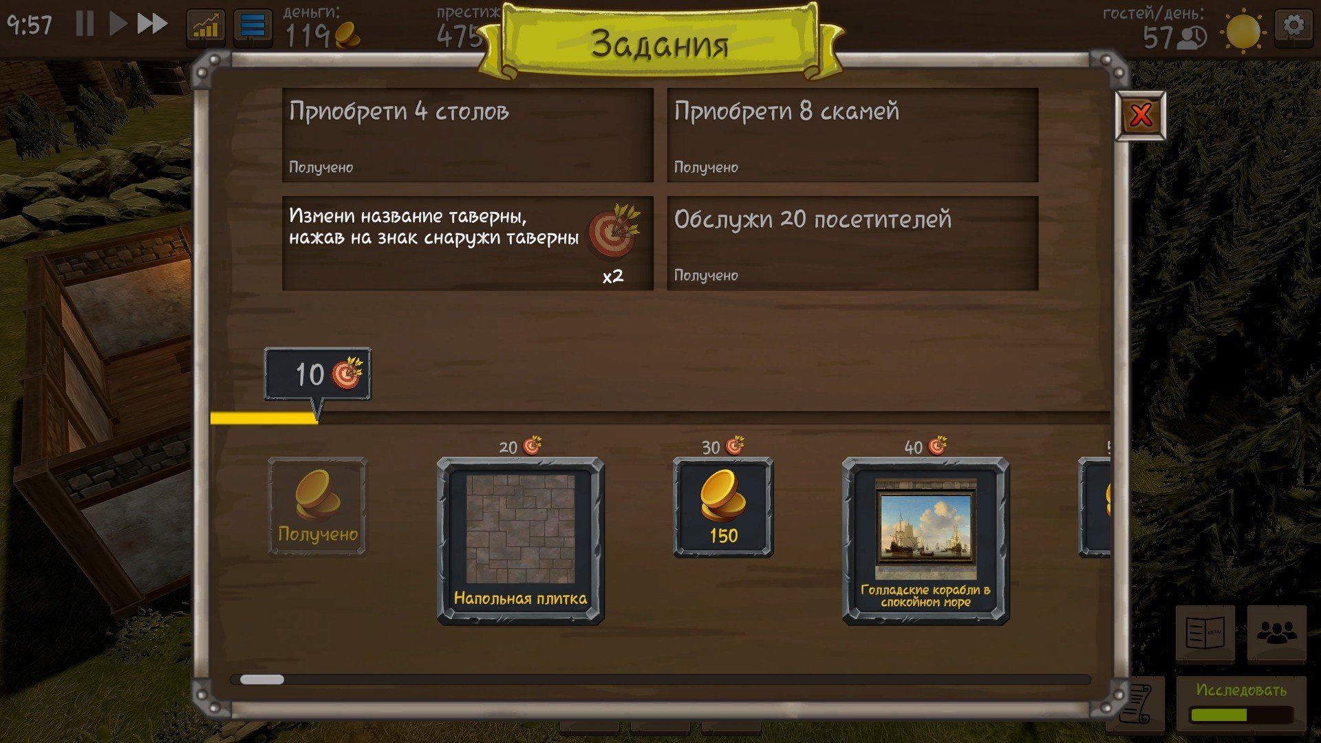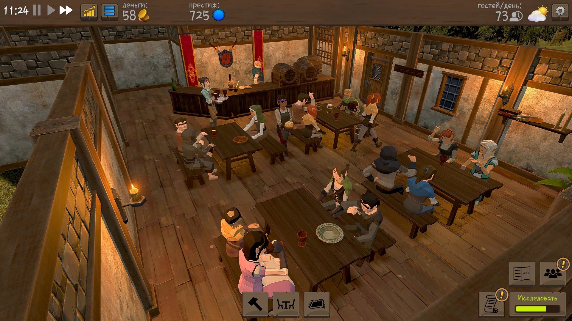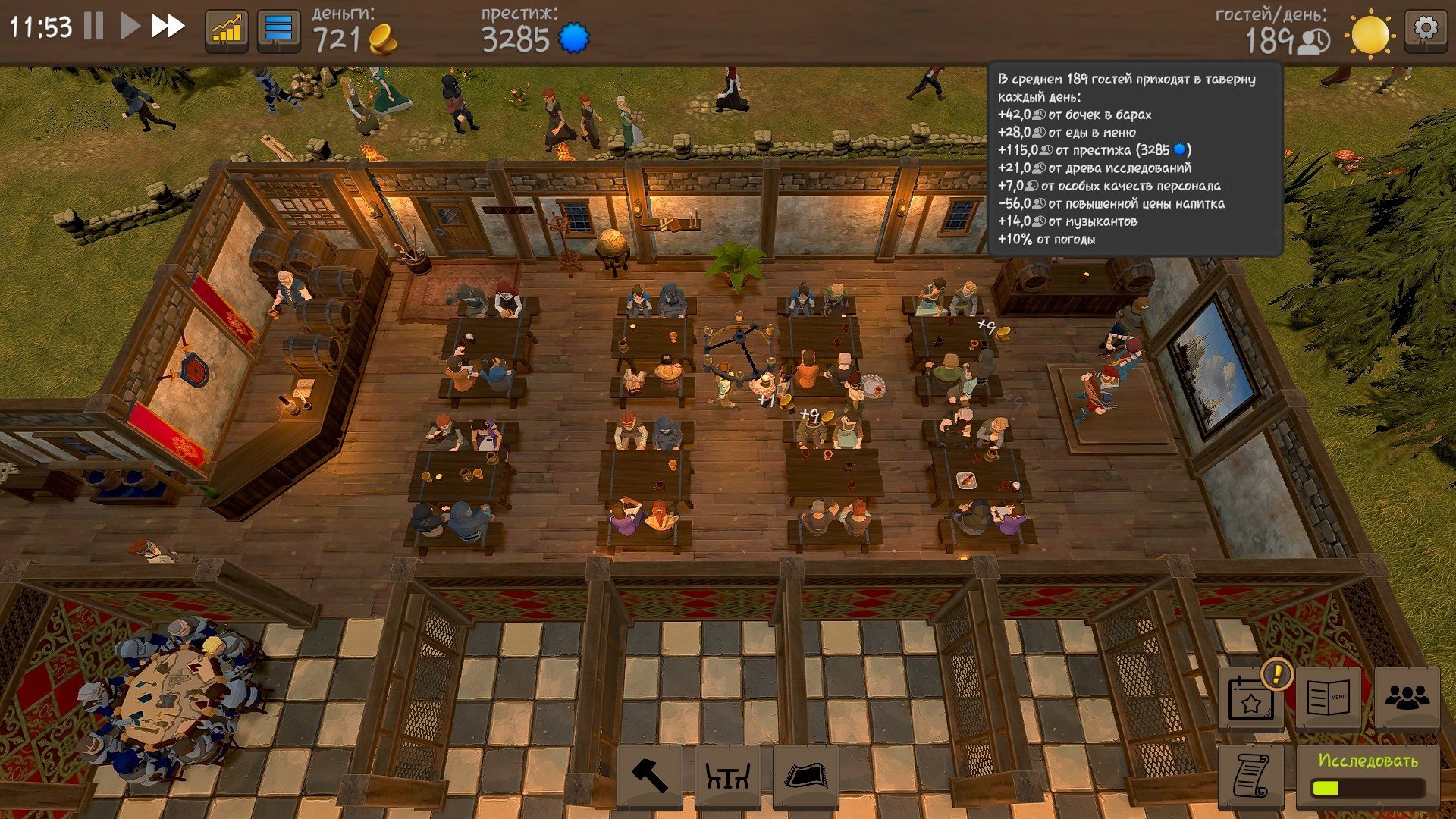 С самого старта вам доступно древо исследований, благодаря ему можно открыть новый сервис для клиентов, новые напитки, улучшения престижа и новые декорации. Очками исследования служат сами посетители вашего заведения. В свою очередь они делятся на 4 типа: простолюдины (серые), зажиточные крестьяне и разорённые рыцари (красные), представители знати (золотые) и легендарные персонажи, например королевская особа или чародей Мерлин (фиолетовые).