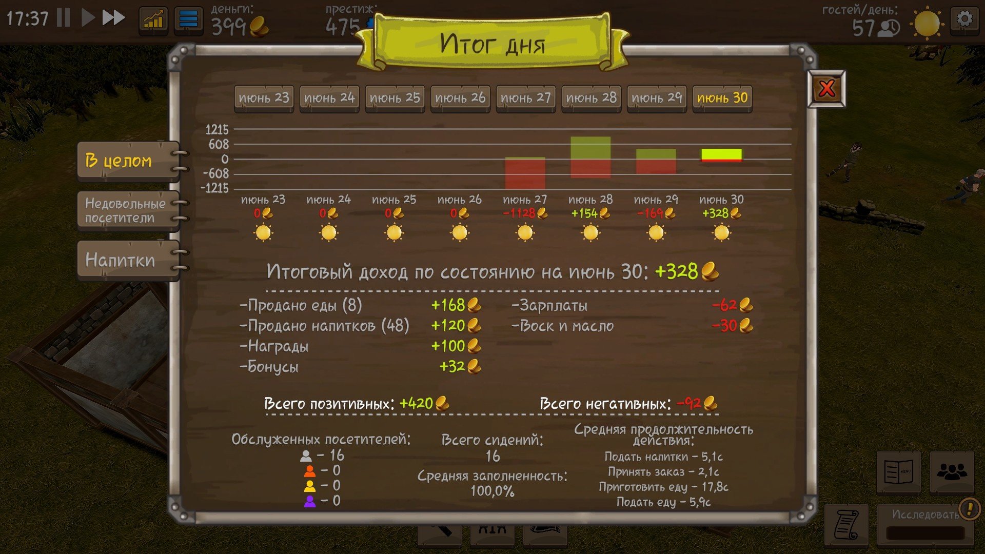 В конце каждого дня вам будет показана подробная статистика о затратах и доходах за день. Сколько посетителей осталось недовольными, какие напитки покупали больше всего и прочее. Всей этой информации более чем достаточно, а также вы можете переключаться между другими днями для сравнения. Таблицу можно вызвать в любой момент нажав на соответствующую кнопку в верхнем левом углу, если не хотите ждать конца дня.
