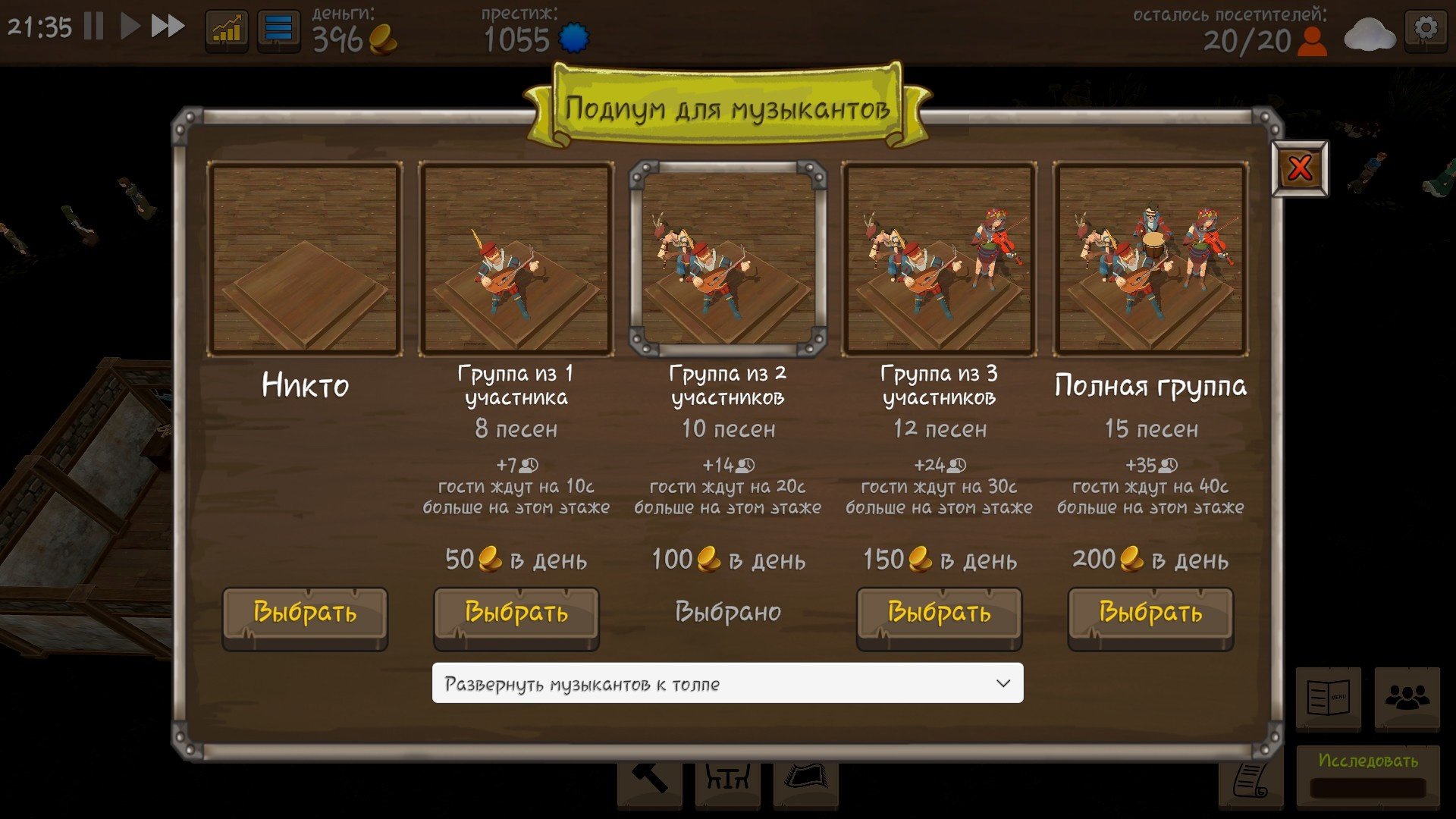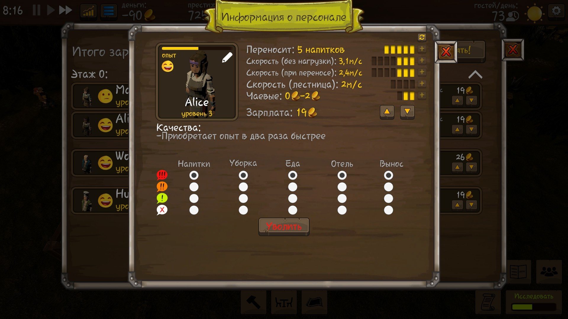 Когда ваша таверна станет многоуровневой, у вас появится возможность закреплять персонал за конкретным этажом. Ведь пока официантка с первого этажа добежит с заказом до четвёртого, клиент устанет ждать и уйдёт недовольным.