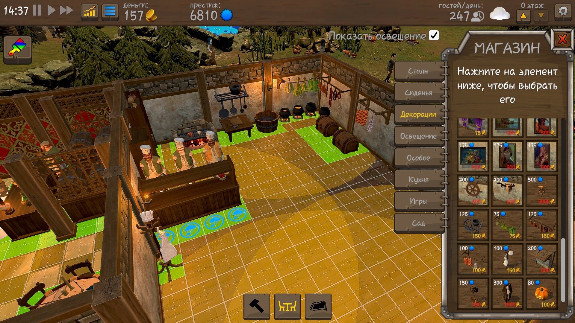Одна из основных механик игры — это редактор помещений. Вам доступны различные стены: глухие, с окнами, с дверями или же порталами, перегородки для лаунж-зон. Раскрасок для стен и пола все ничего и подобный набор явно недостаточен. На мой взгляд нужно больше узоров и комбинаций. Зато вариаций настенного кирпича аж несколько штук, что малость безвкусно.