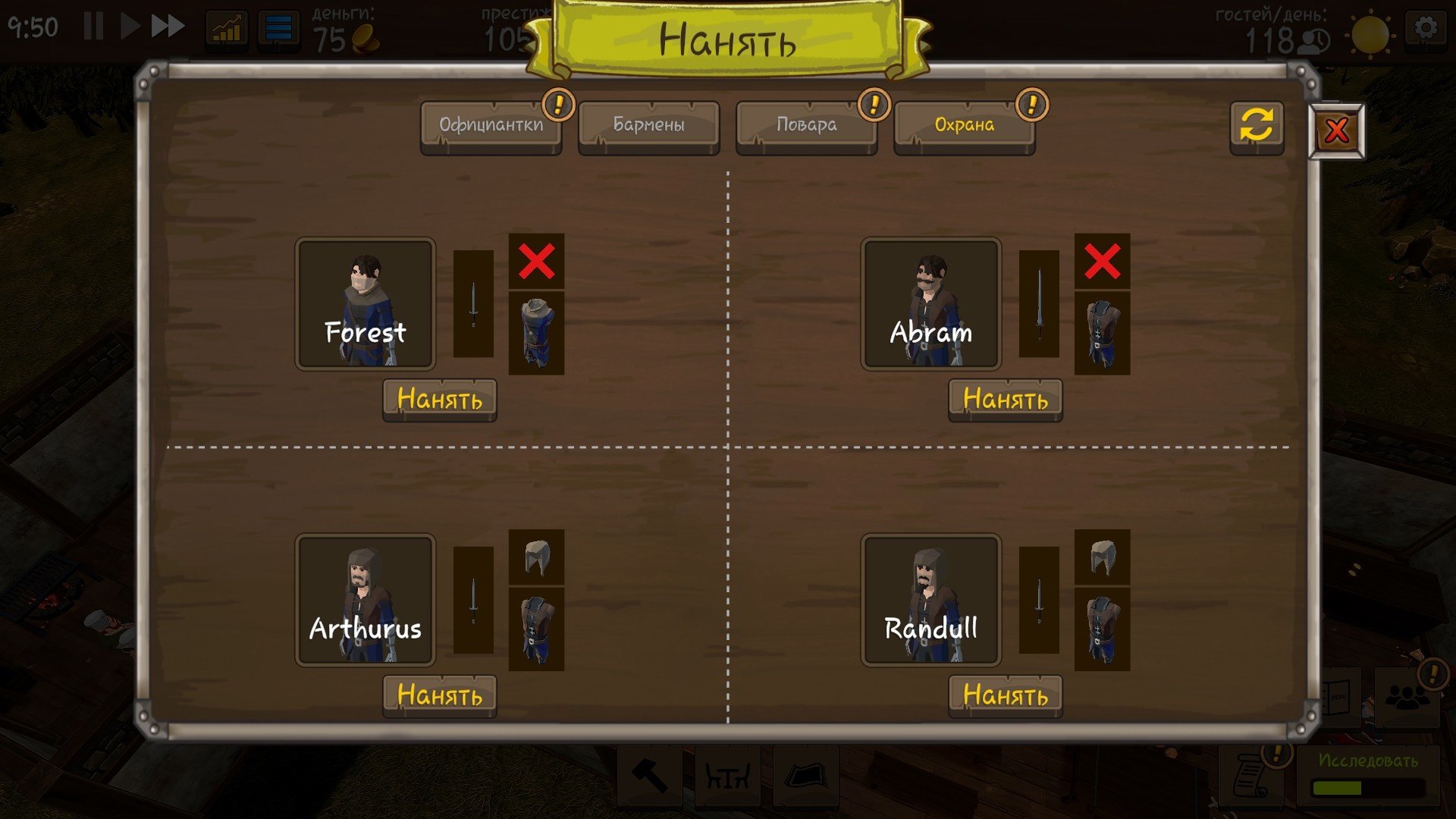 Наняв охранника, у вас есть шанс обезопасить себя от кражи. Кражи делятся на три типа: низкие, средние и высокие угрозы. Экипируя своего сторожа шлемом, бронёй и оружием вы повышаете его шанс защитить вас от угроз.