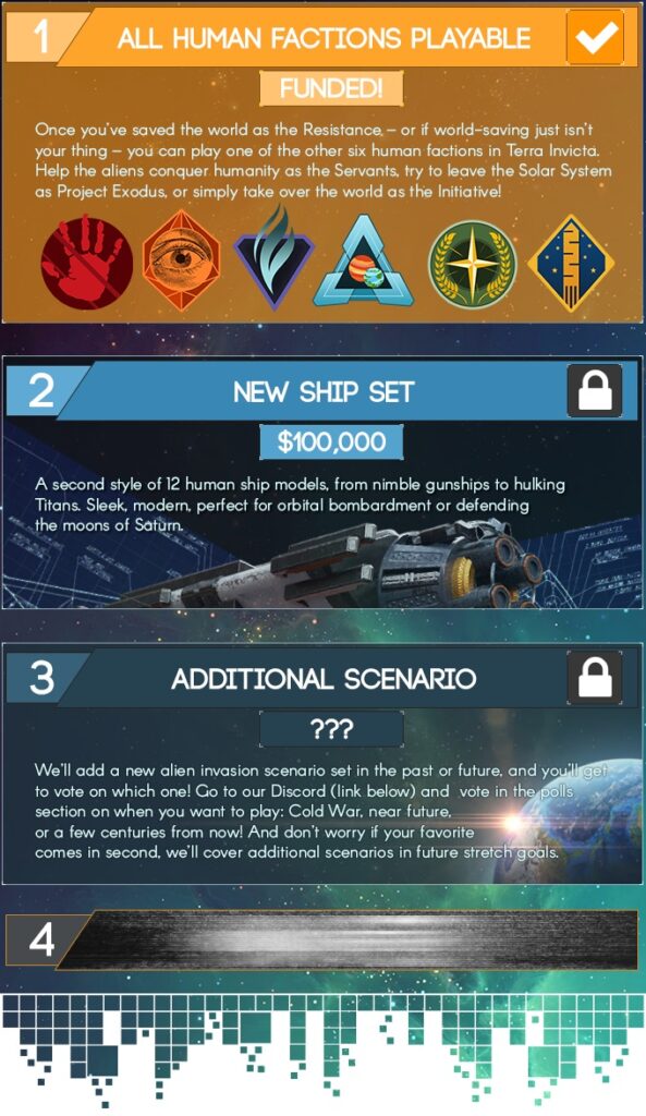 Ниже вы можете увидеть первоначальную дорожную карту сбора средства. За минимальный размер, который уже удалось собрать, разработчики пообещали сделать 6 играбельных фракций Землян. Если же им удастся собрать $100,000, то игроков ждёт дополнительный набор моделей космических кораблей.