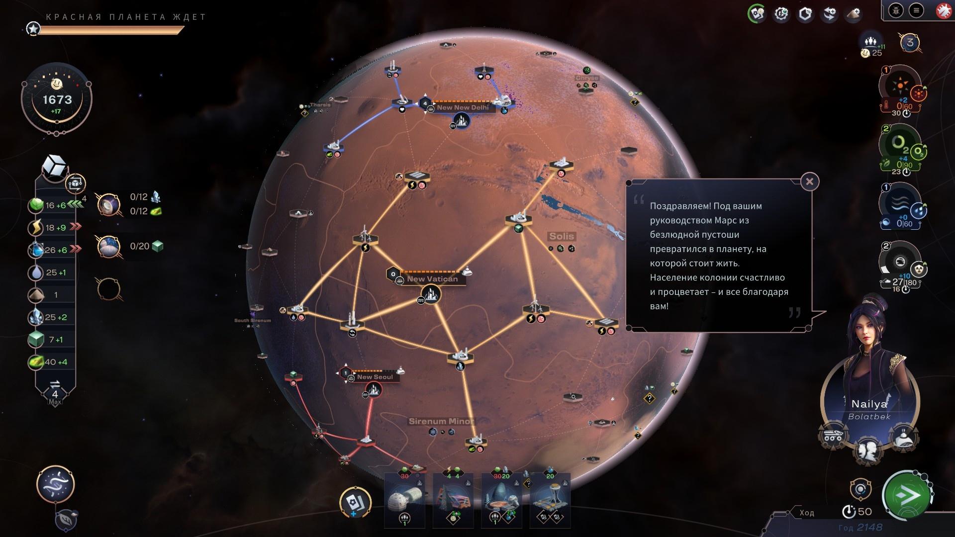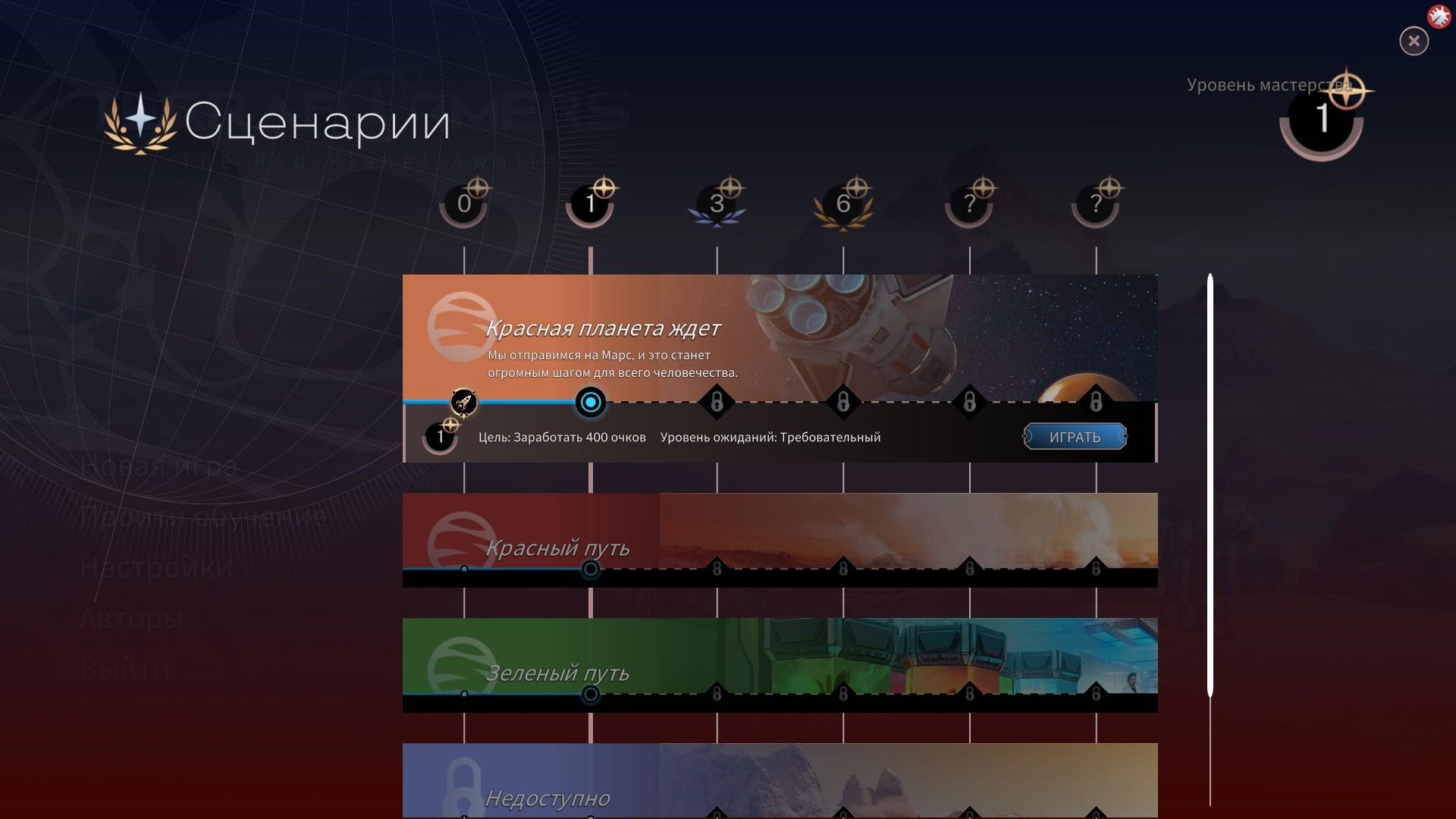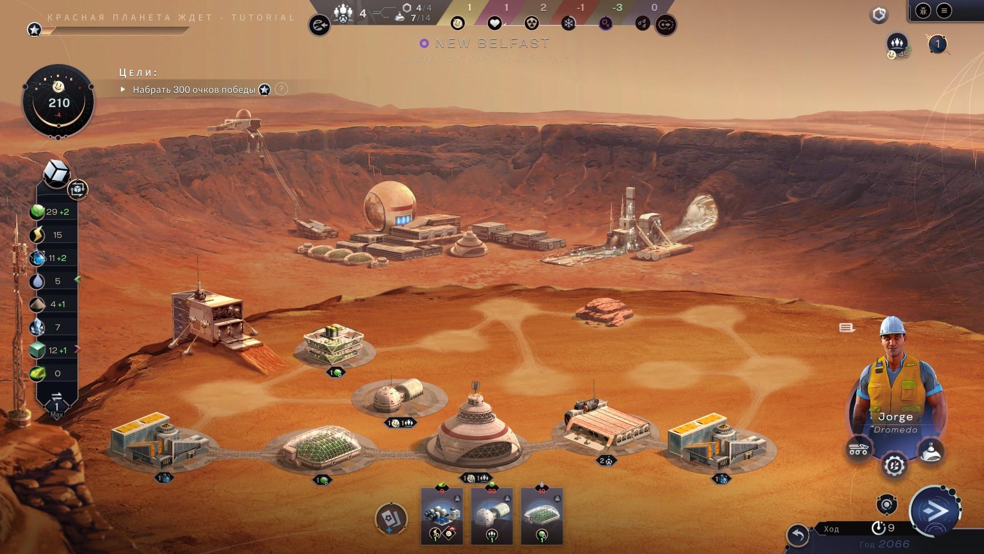 Условные 200 победных очков набираются за всего лишь несколько десятков ходов, сценарий завершается, продолжать развитие колонии становится невозможно, и необходимо начинать новый сценарий. Более того, за успешные завершения сценариев игрок повышает свой уровень, и ему открываются новые технологии и здания (да-да, внутри одной отдельно взятой партии очки науки — это такой же строительный ресурс как, например, титан).