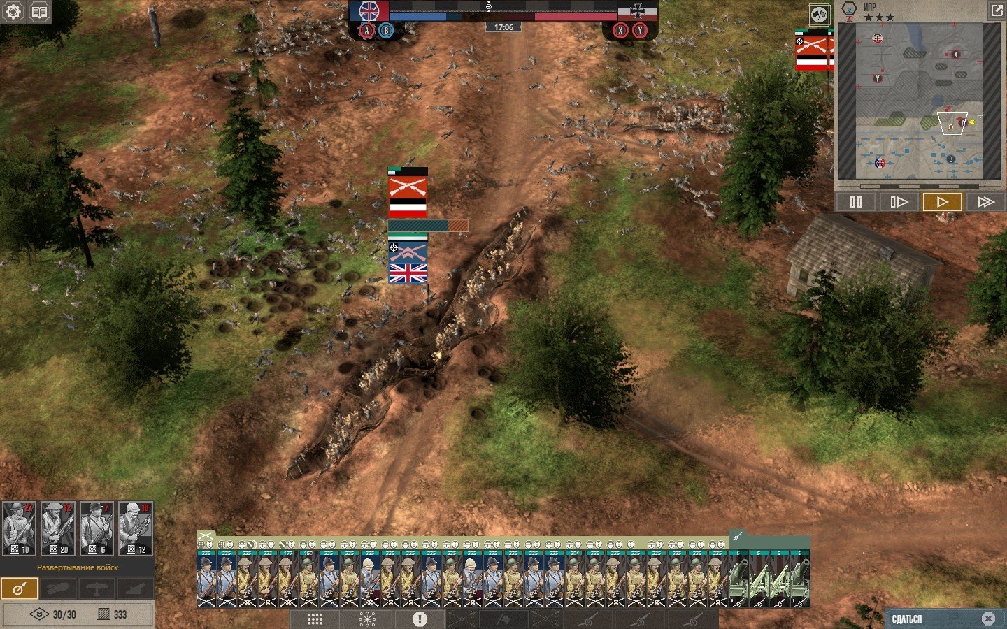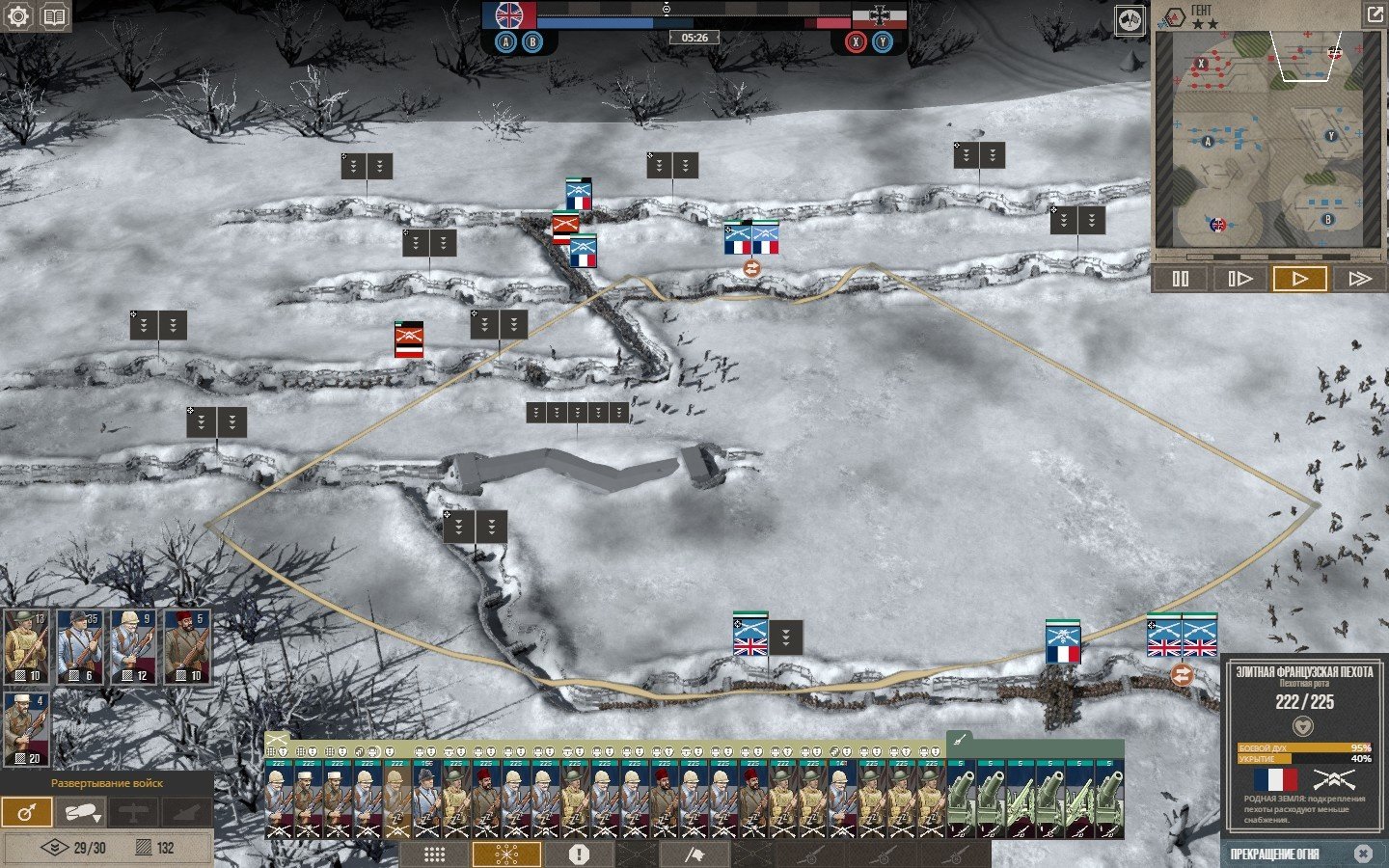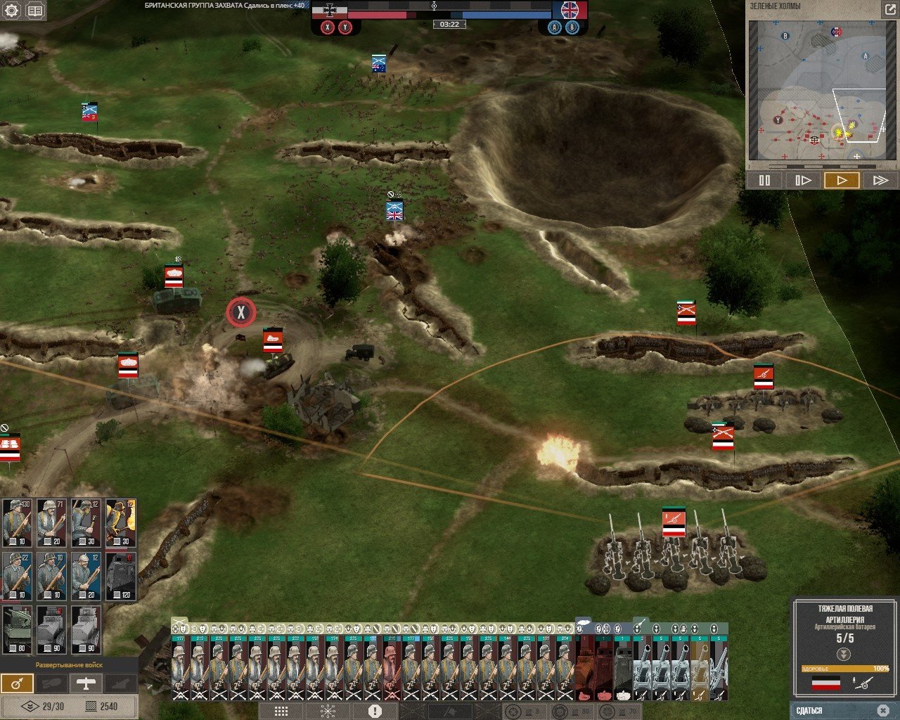 Впрочем, и в самом окопе возможны, скажем так, заторы. Когда противник пытается контратаковать только что занятый окоп, ты бежишь ему навстречу в надежде подловить и хоть немного побить по частям… И в итоге 30-40 секунд войска просто стоят где-то между окопами, не двигаясь.