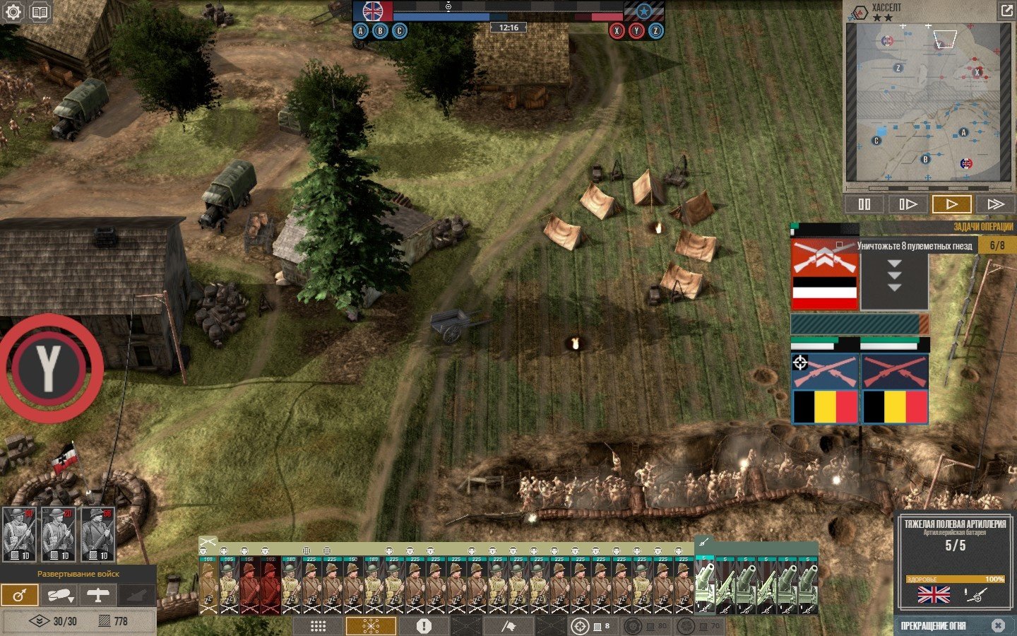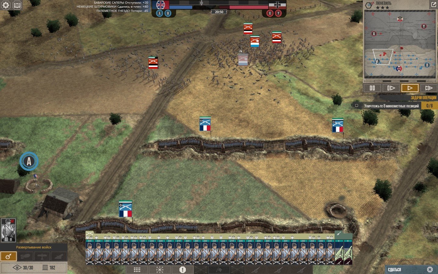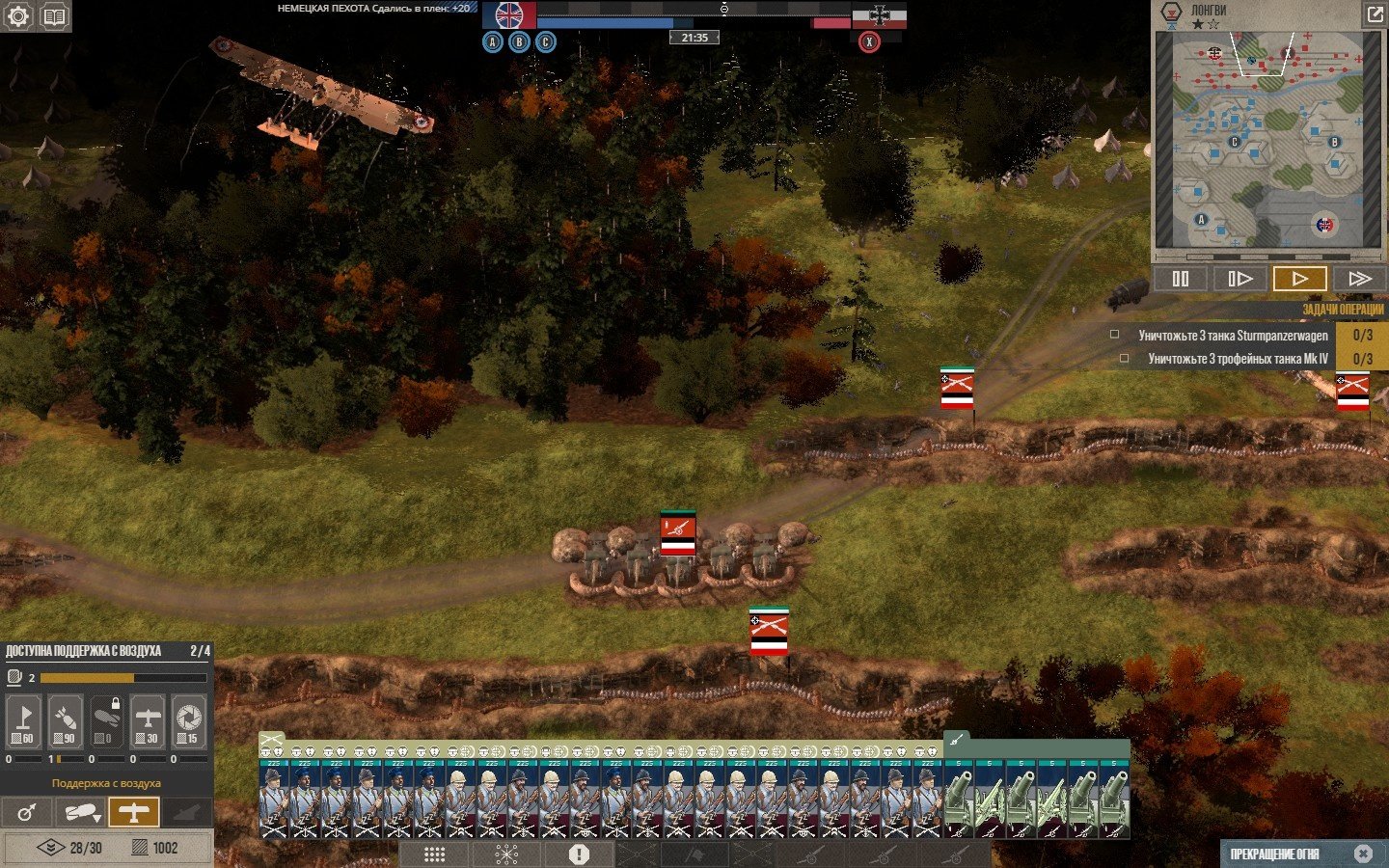 Если атакующие врываются в окоп, то тут же начинается рукопашная, на которую игрок оказать никакого влияния не может: атакующих в окопе тоже может быть только две роты, то есть реализовать численное превосходство не получится. Банально вывести потрёпанную роту из боя, заменив свежим подкреплением невозможно, заставить ее просто отступить с поля боя полностью — невозможно. Бой будет продолжаться до победного конца, игроку предлагается просто смотреть на убывающие полоски численности и боевого духа на флажках отрядов. Такой концепт в первый десяток часов едва не заставил меня удалить игру — мало интересного наблюдать за абстрактными флажками дерущихся в окопах отрядов.