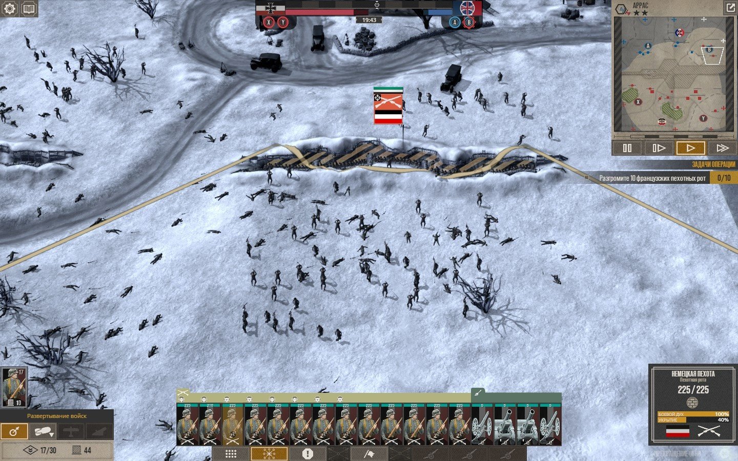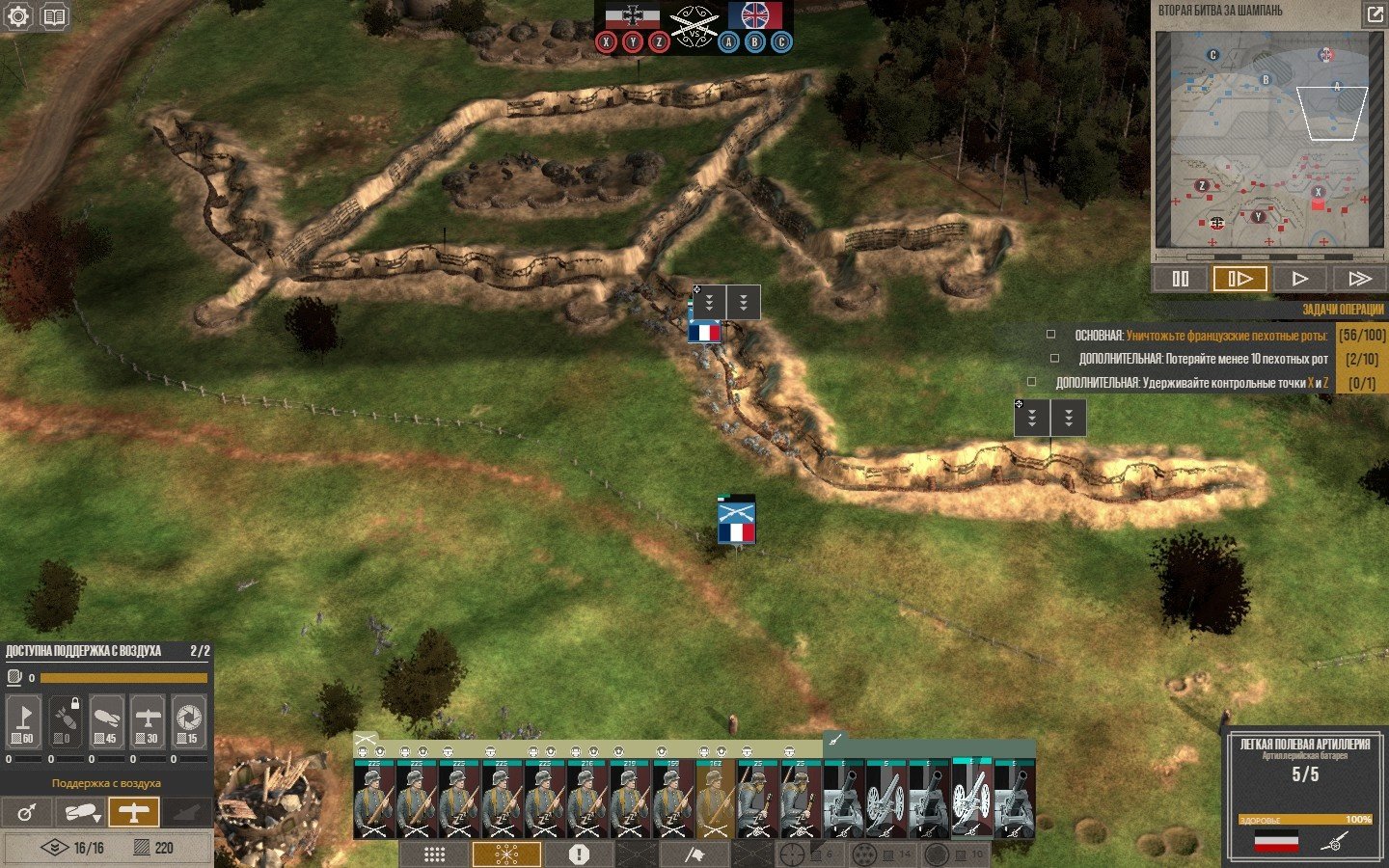 Соответственно, в наступлении остаётся только работать артиллерией, изредка, авиацией, подавляя и убивая защитников, и маневрировать пехотой по окопам, ведь вне окопа пехота долго не живёт. Какого-то иного средства воздействия на поле боя, по крайней мере до гипотетического появления танков у игрока нет.