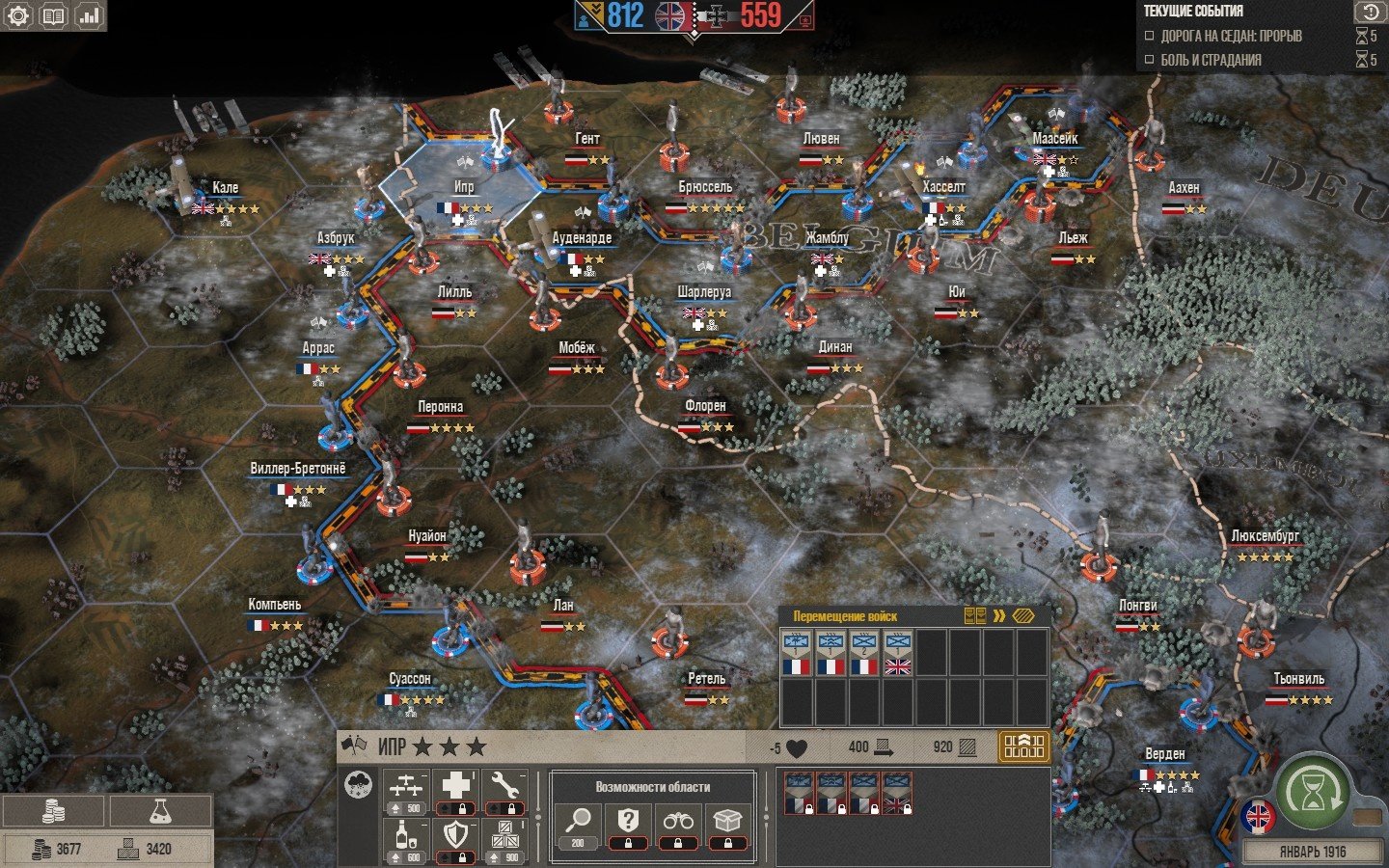 Подводя некий итог по стратегической части хотелось бы сказать, что, во-первых, она даже как вещь в себе, как набор механик и условностей, не поражает воображение, изобилуя странными упрощениями и костылями, пытающимися уравновесить баланс. Во-вторых, подобный подход к реализации стратегической карты весьма слабо отражает реалии Первой Мировой. Перевезти за месяц 20 корпусов из Бельгии в Вогезы — за такое, думаю, Шлиффен, Мольтке-младший или Людендорф отдали бы душу. Кроме того стычки групп корпусов, как броуновские частицы перемещающиеся туда-сюда, не передают масштабы и механизмы ПМВ с её огромными фронтами от моря до моря, скоординированными наступлениями миллионных войсковых группировок с их ветвистыми иерархическими структурами.