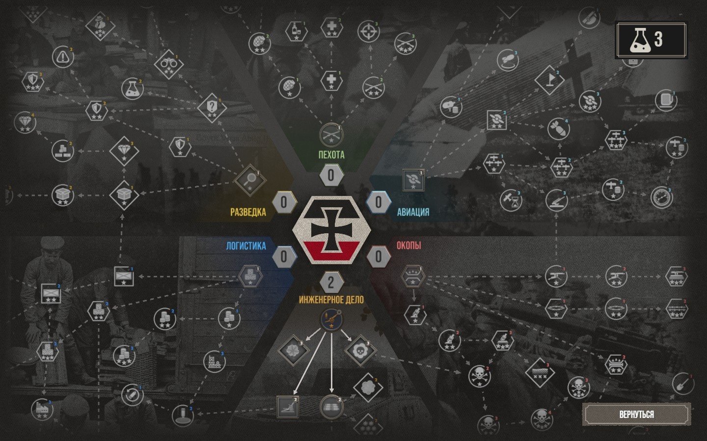 Технологическое древо весьма разветвлённое, с шестью основными ветвями и множеством пересекающихся отростков, но игра честно предупреждает, что изучить всё в рамках даже гранд-кампании не получится, так как раз в ход до начала 1916 года игрок получает одно очко исследований, с 1916 — два очка, в то время как одна технология из середины-конца ветки может стоить 3-5 очков. Так что закончить ПМВ без танков, авиации или не научив артиллеристов огневому валу вполне реально.