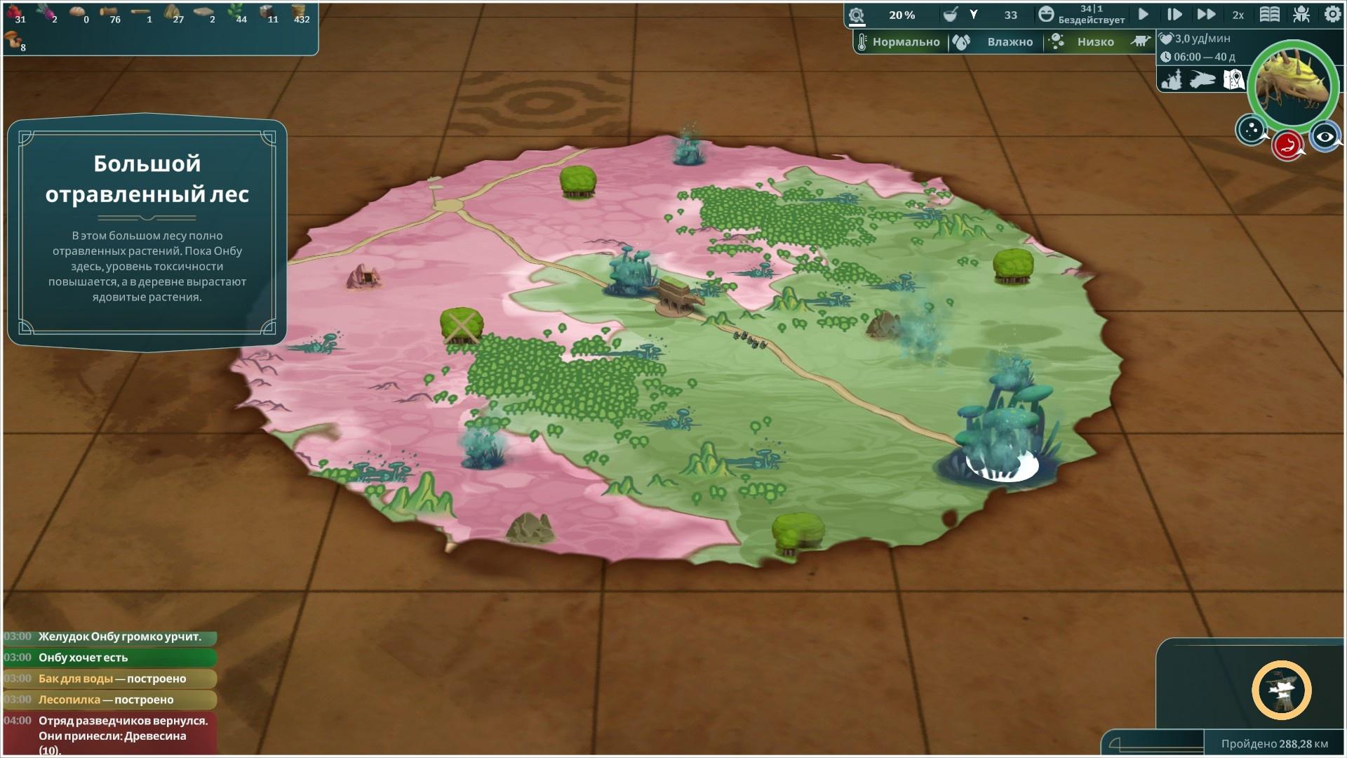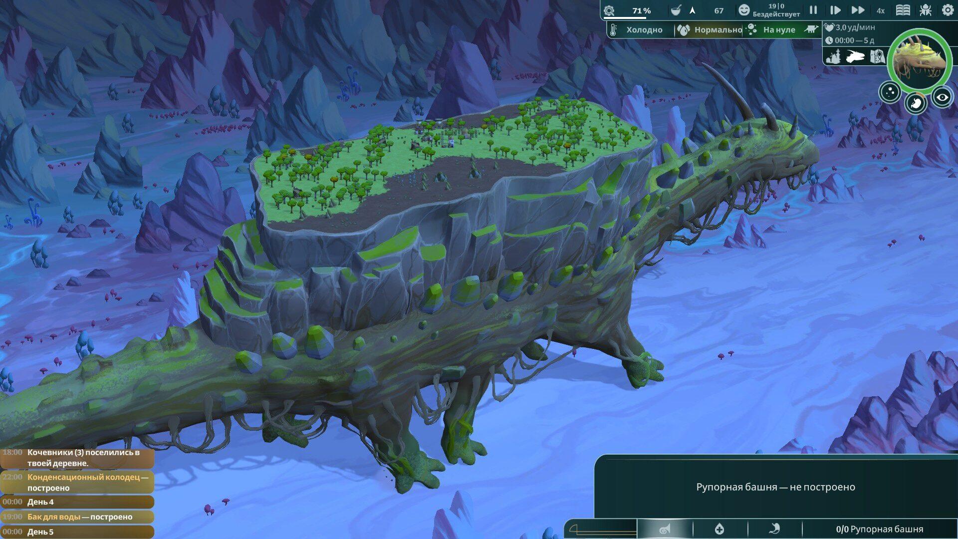 Игра посвящена управлению колонией в рамках небольшой (не)замкнутой экосистемы, где подавляющая часть внешнего влияния довольно агрессивна и проявляется в виде распространения болезней. Будучи не понаслышке знакомым с данным поджанром менеджмента колонии с некоторым упором на эко-составляющую, я сразу подошел к развитию колонии предельно аккуратно, размечая в древе технологий намётанным взглядом выход в возобновимые или, хотя бы, относительно возобновимые источники ресурсов. В общем-то просто имея опыт в стратегиях, можно заметить подобную направленность развития технологий, одновременно отмечая, что опции, нарушающие хрупкое доверие между гигантом Онбу и обитателями его широкой спины тоже имеют место быть, и они отнюдь не бесполезны. Даже на максимальной сложности почти всегда игра начинается довольно неспешно: первые несколько биомов на пути могут создать челлендж кому угодно, но не ветерану в жанре менеджмента поселений. Но вот потом игра постепенно отпускает вожжи, сдерживавшие генератор, в какой-то момент бросая их совсем и отдавая всё на откуп Святому Рандомию – и тут могут разразиться бездны невиданные. Баланс ресурсов в игре прост, я бы сказал даже «примитивен», и на не слишком высокой сложности, в принципе не способен доставить никаких проблем: игра стремительно превращается в интерактивный скринсейвер (что, впрочем, никак не умаляет остальных её достоинств).