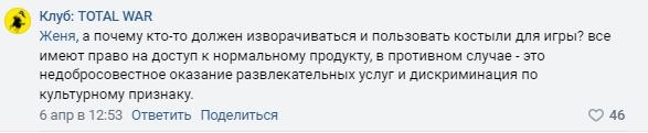 В свете этого одно из крупнейших сообществ Вконтакте, посвящённое данной серии игр Клуб: TOTAL WAR призвало подписать петицию по возвращению языка. В петиции они обвиняют разработчиков в ненависти к русскоговорящим и прогнозируют падение доходов.
