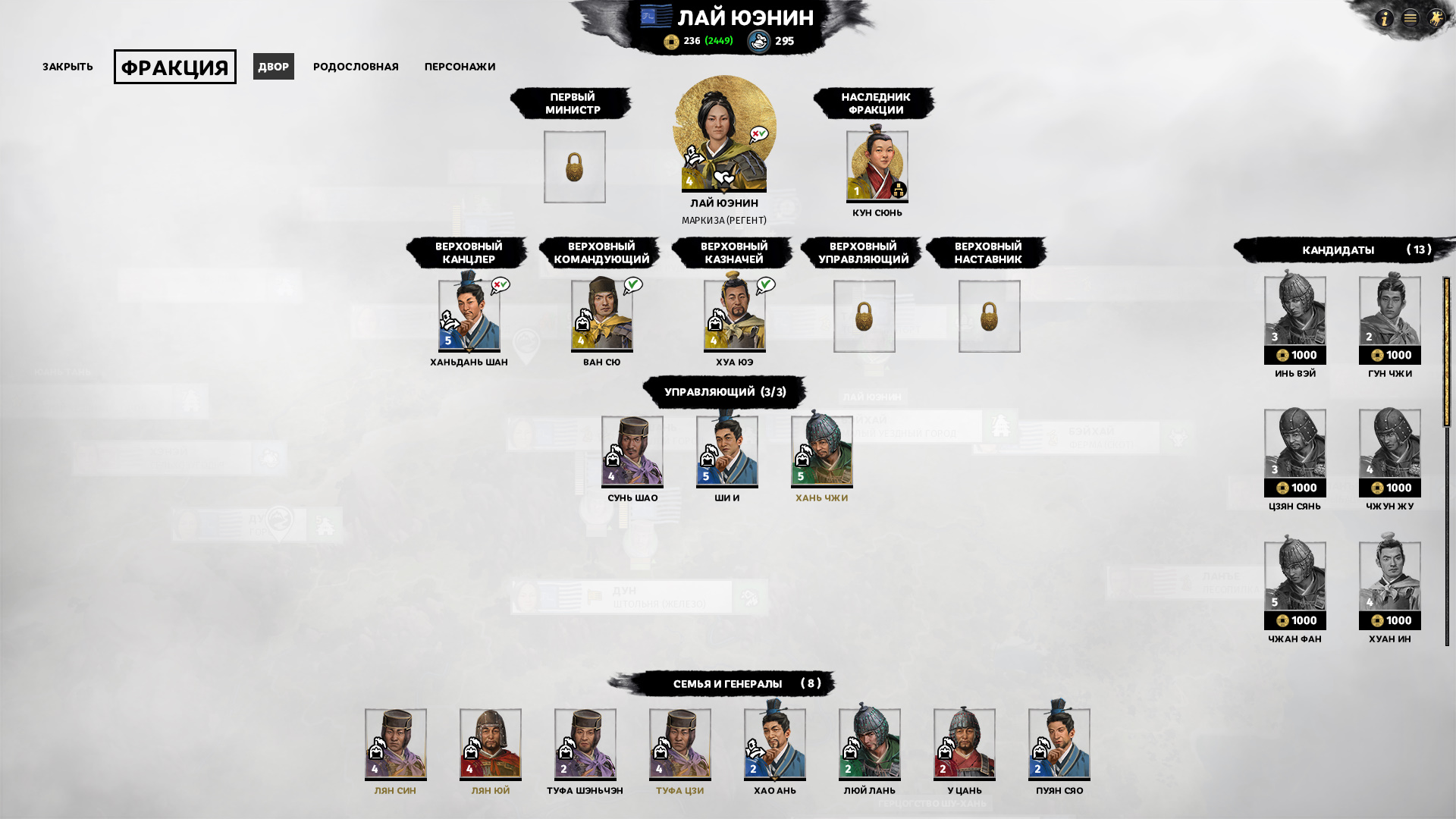 У каждого правителя есть приближённые, и это отражено в Three Kingdoms. Изначально двор игрока представлен его персонажем во главе, а также нанятыми военачальники и министрами, но они не занимают никаких должностей, кроме как военачальник или исполнение поручений в областях. Но по мере роста государства двор постепенно увеличивается, появляются новые должности и возможности, а интриги вокруг вас и вашей семьи растут.