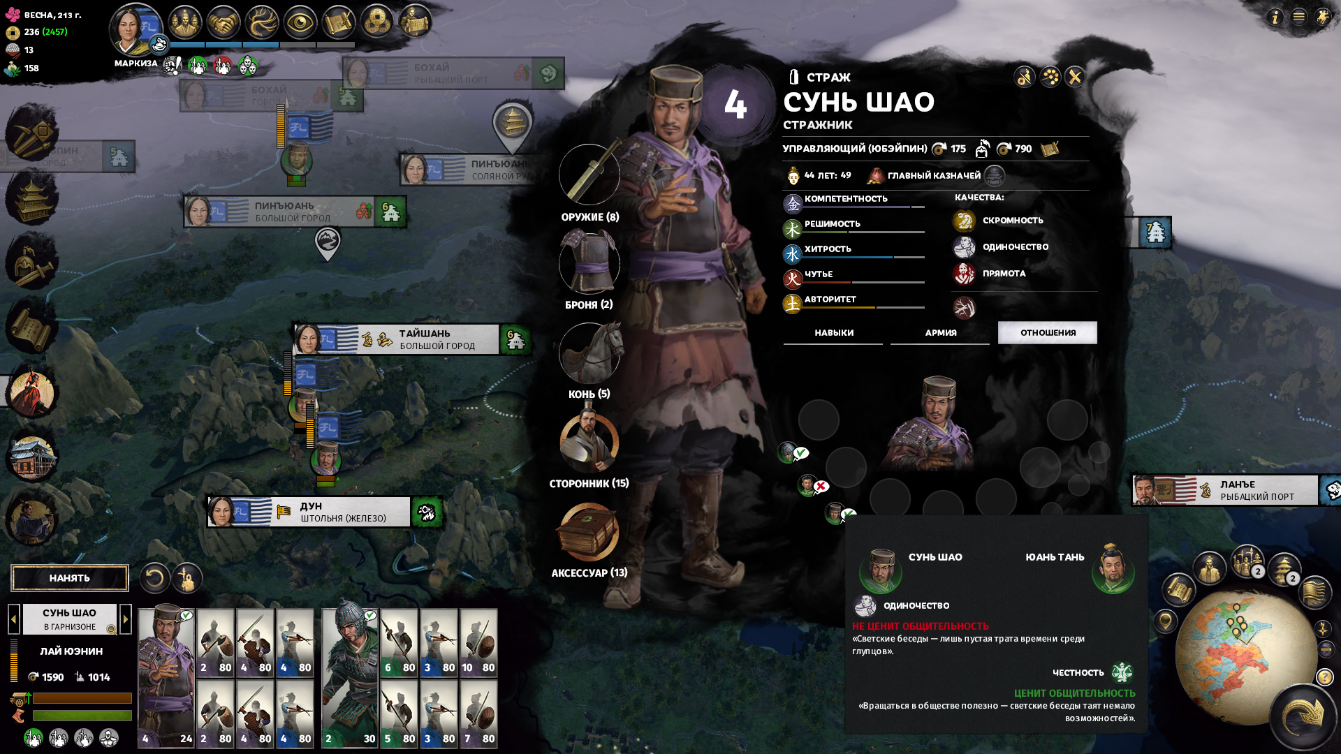 Разработчики смогли реализовать очень интересную систему взаимоотношений (они назвали ее “Система Гуаньси”). Чем дольше идет игра, тем заметнее это становится. Ваш военачальник может сойтись в битве с армией своего друга и не убьет его/возьмет в плен. Каждое событие и действие может иметь долгоиграющие последствия, влиять на шпионаж, ваш двор и фракцию – на сложностях выше средней это становится важным фактором. На средней сложности в относительно плохом положении в отношениях двора игрок всё ещё сможет изменить ситуацию, но вот на сложностях повыше это станет весьма трудной задачей.