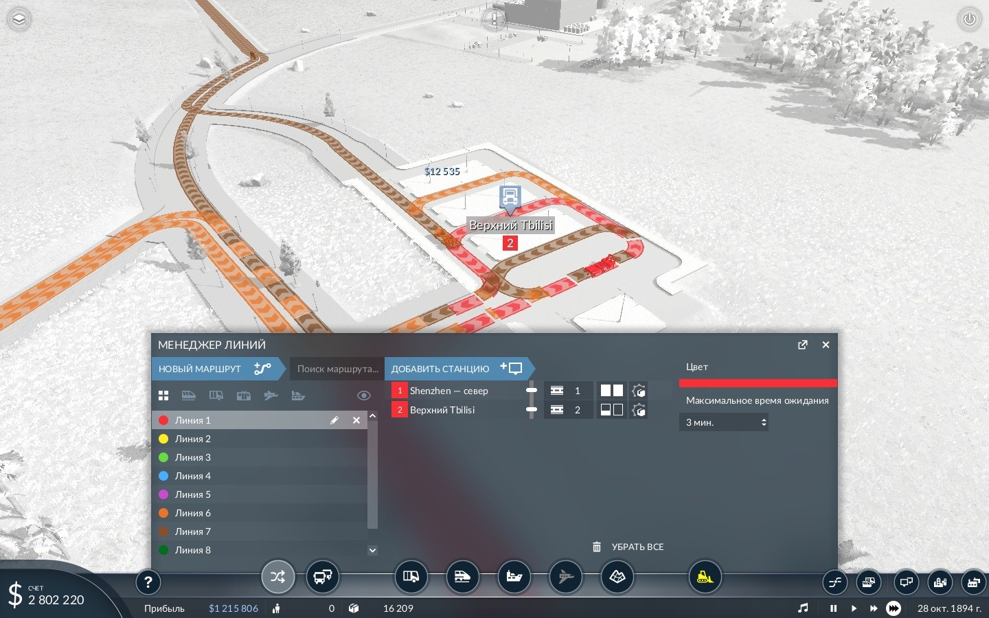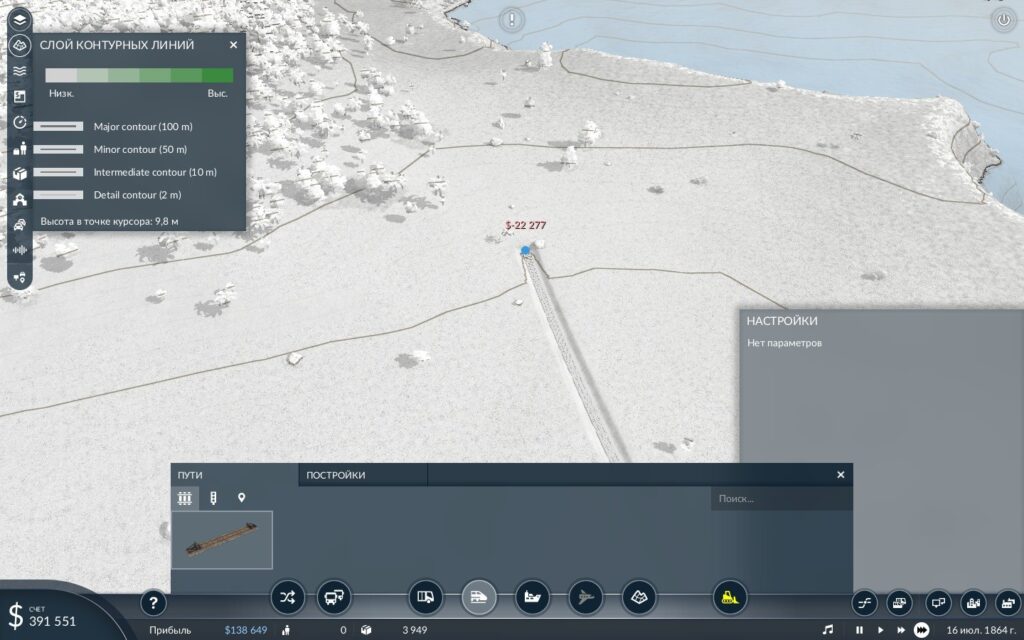 Довольно удобно просто протянуть линию от одной точки к другой, однако в таком случае она, скорее всего, обойдётся вам в круглую сумму, ведь игра попытается изменить ландшафт каждой неровности на пути – а услуги виртуальных копателей дороги, особенно если они вдруг решат выкопать тоннель. Гораздо выгоднее прокладывать линии небольшими отрывками шаг за шагом, обходя неровности и добиваясь минимальной стоимости каждого шага – это позволит сохранить огромные суммы денег. Увидеть неровности поможет фильтр карты «Слой контурных линий», который можно включить, щёлкнув по значку карты слева вверху.