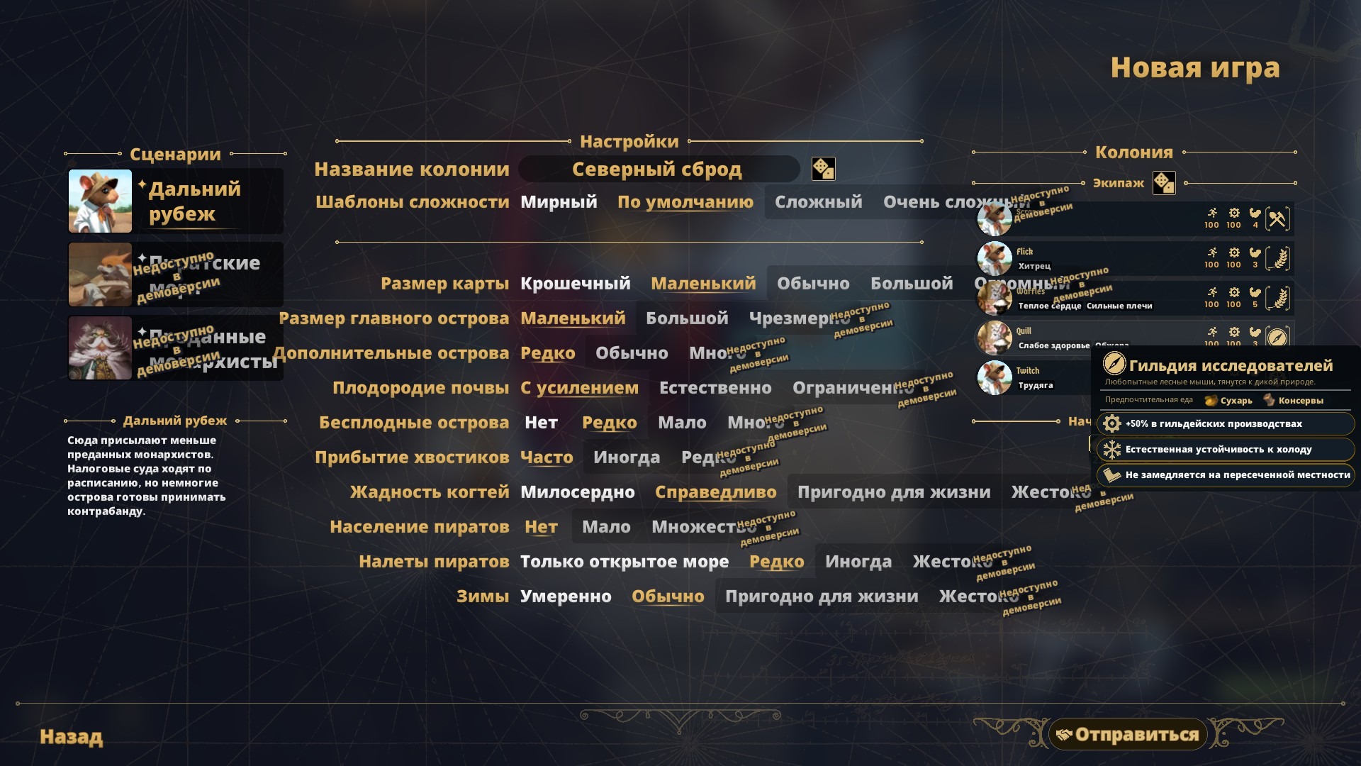 Так же вам предстоит выбрать состав первых хвостиков – это местное название поселенцев-мышей. У хвостиков есть принадлежность к гильдиям. Гильдий четыре:
