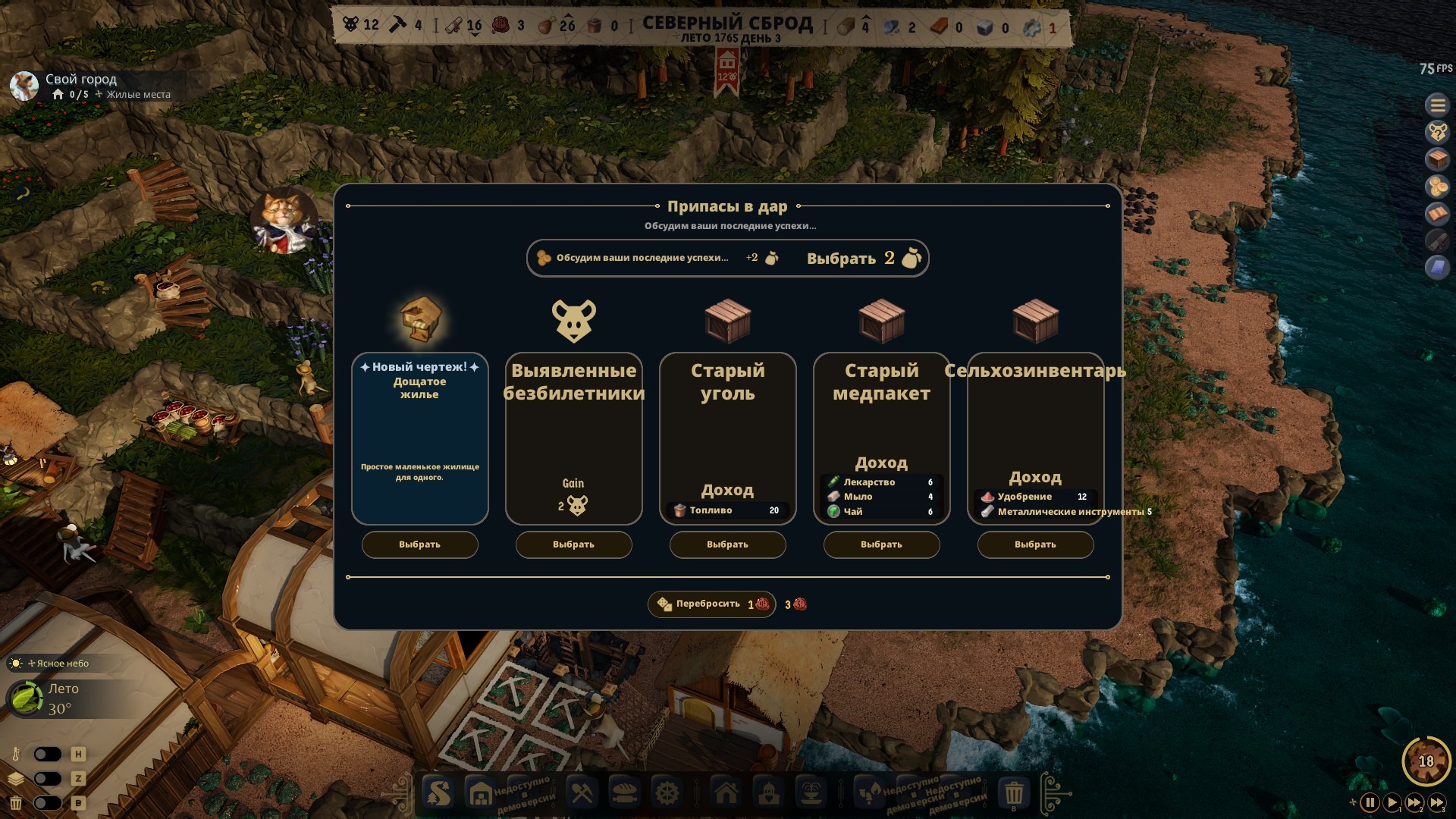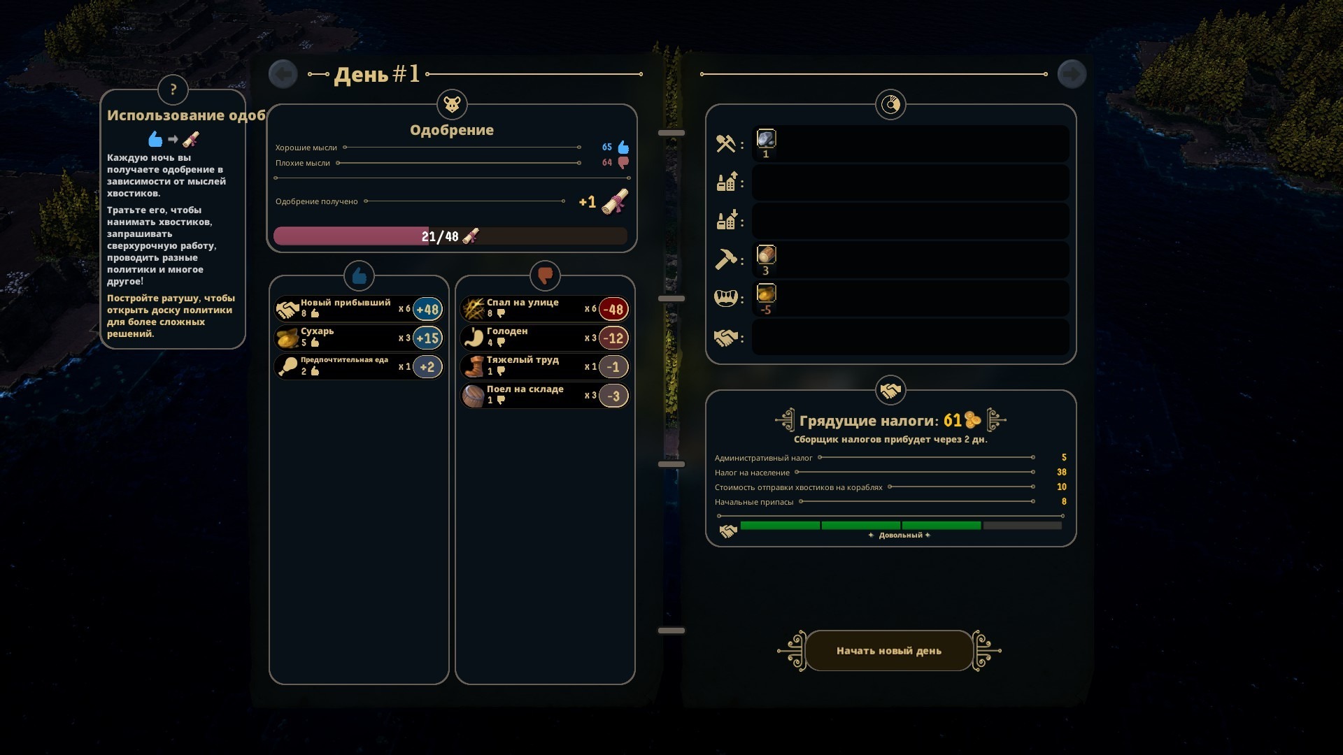 Население не размножается естественным образом – увеличить его вы можете только благодаря мигрирующим хвостикам. Это выглядит следующим образом: приплывает судно с пятью мигрантами, и вы выбираете, кого и сколько из них мы хотите и можете взять. За получение новых поселенцев вы платите одобрением, которое можно получить за удовлетворение нужд уже имеющихся колонистов.