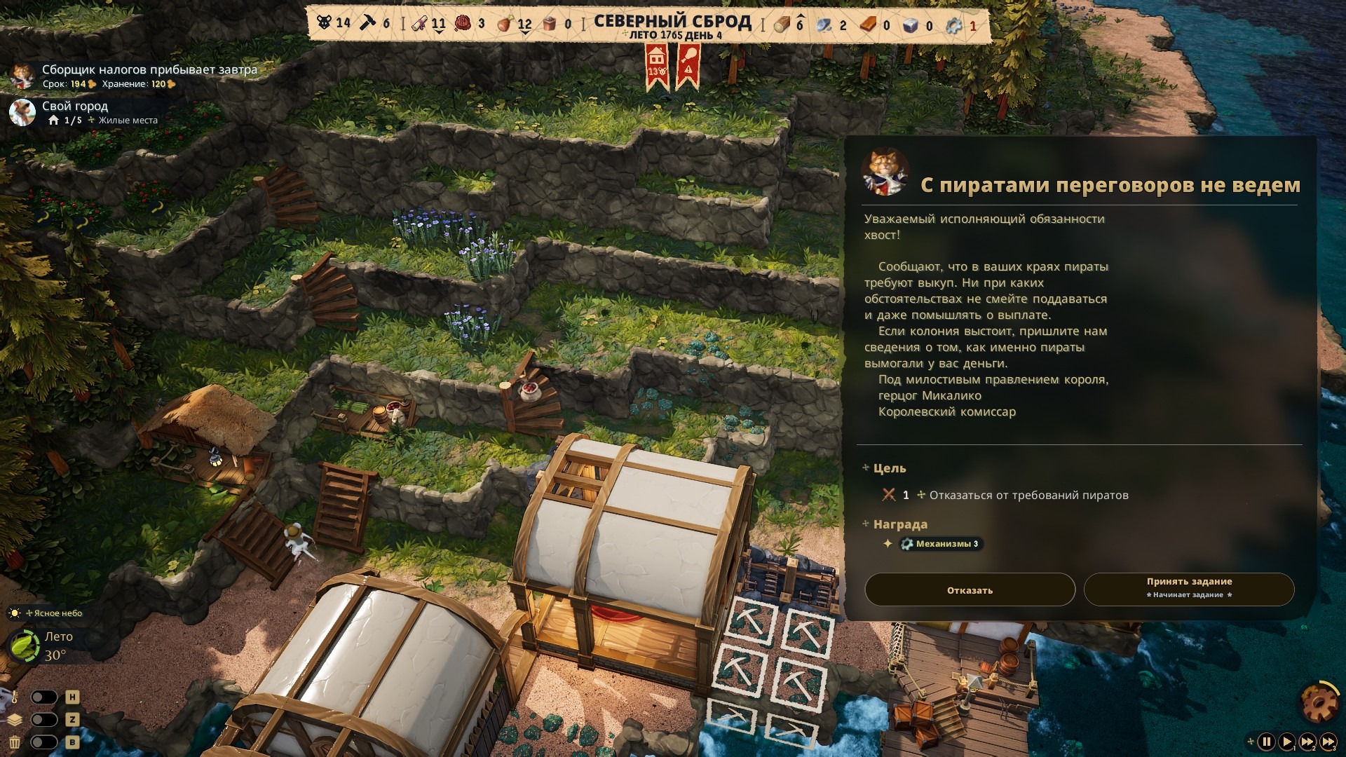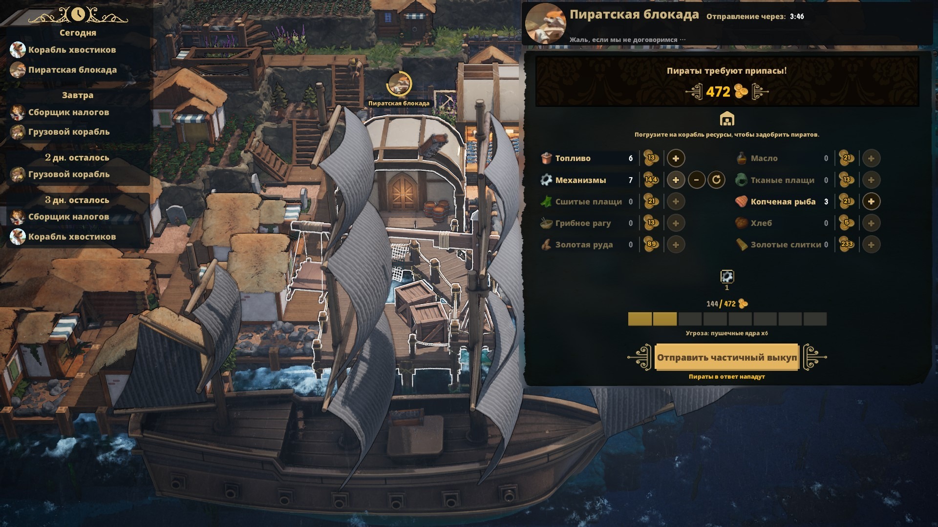 В какой-то момент объявляются ещё одни посетители – пираты. Они заходят не просто так, а требуют свою долю за безопасность вашей колонии. Причём ресурсы, которые готовы принять пираты, не совпадают с теми, которые требуют ваши хозяева из числа котов. Так что, если успеваете всё добывать и сидеть на двух стульях, то можно успешно платить всем и не страдать от обстрелов. В ином случае… быть мышиным колонистом не так то легко.