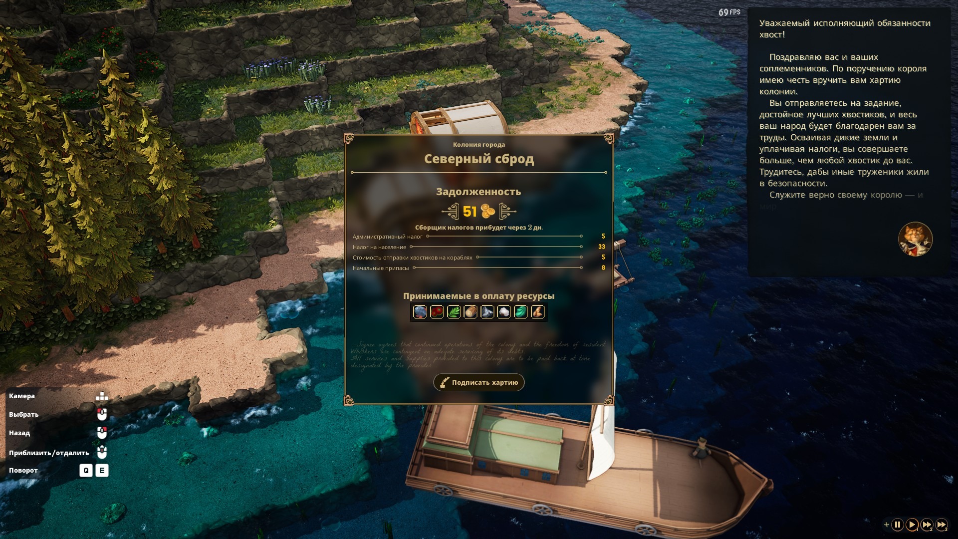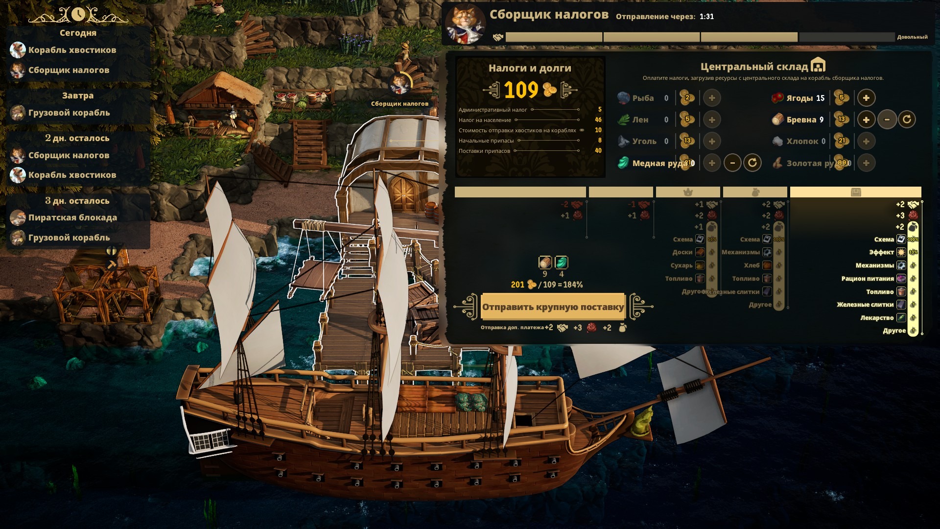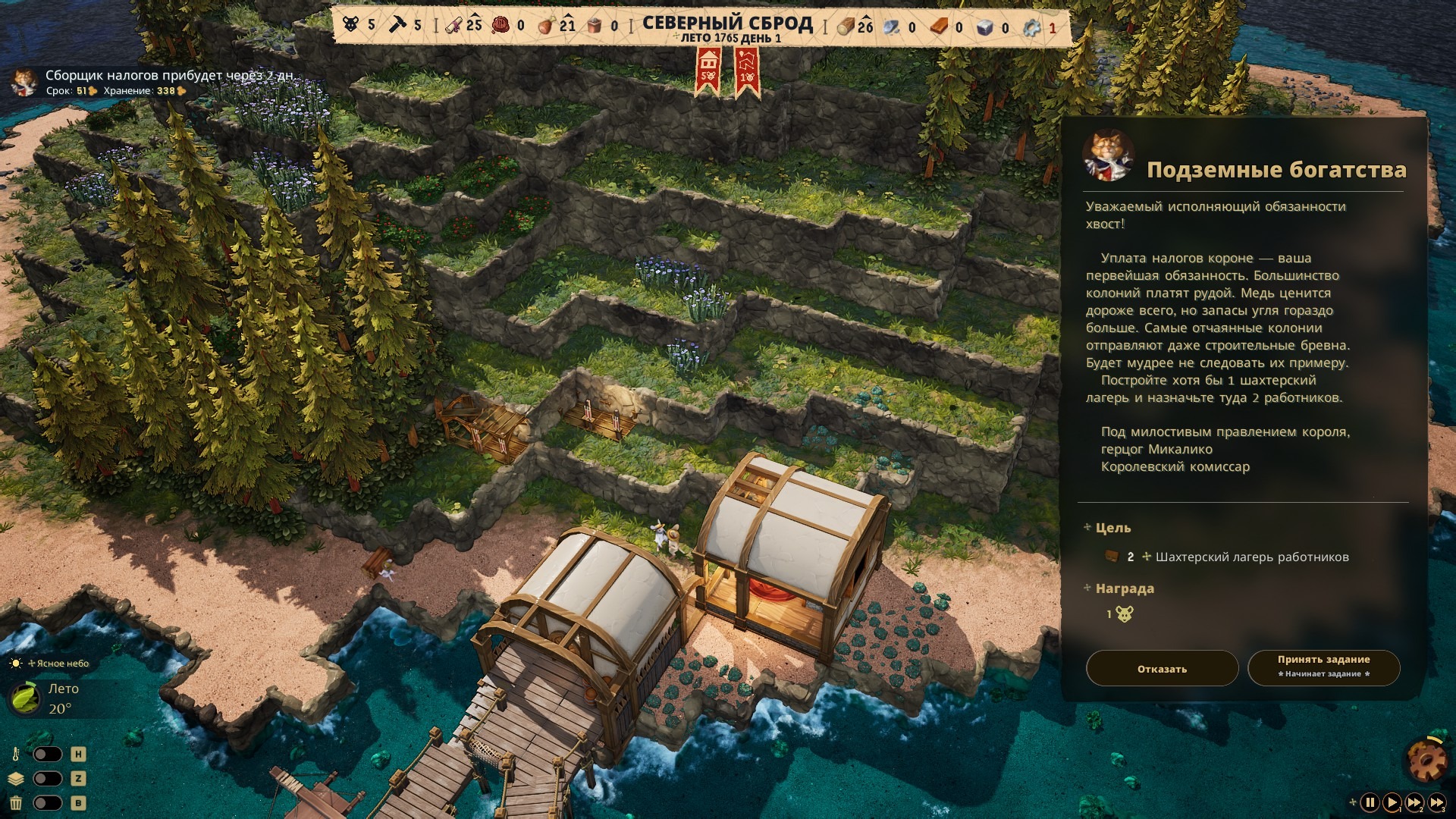 В начале игры вы прибываете на остров, где предстоит создать колонию. Цель – начать разработку местных ресурсов и, конечно же, платить налоги. Налоги динамические: выплачиваются добываемой или создаваемой продукцией, зависят от количества поселенцев, от грузов, которые вы покупаете в метрополии и вообще много от чего. Интересно, что вы обязаны покупать товары метрополии, иначе отношение к вашей колонии будет ухудшаться. Если оно опустится до условного нуля, поселение незадачливых колонистов начнут обстреливать, ломая по несколько зданий. Таким хитрым методом коты регулярно повышают сумму, которую вы будете обязаны выплатить.