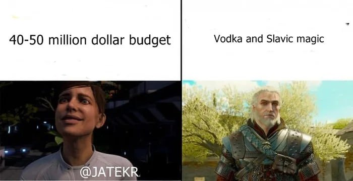 Оригинальный мем высмеивает Mass Effect: Andromeda и 40-50 миллионов долларов, потраченных на его разработку, в сравнении с The Witcher 3, который был сделан при помощи «водки и славянской магии». Ещё более интересно, что бюджет The Witcher 3 на самом деле был больше.