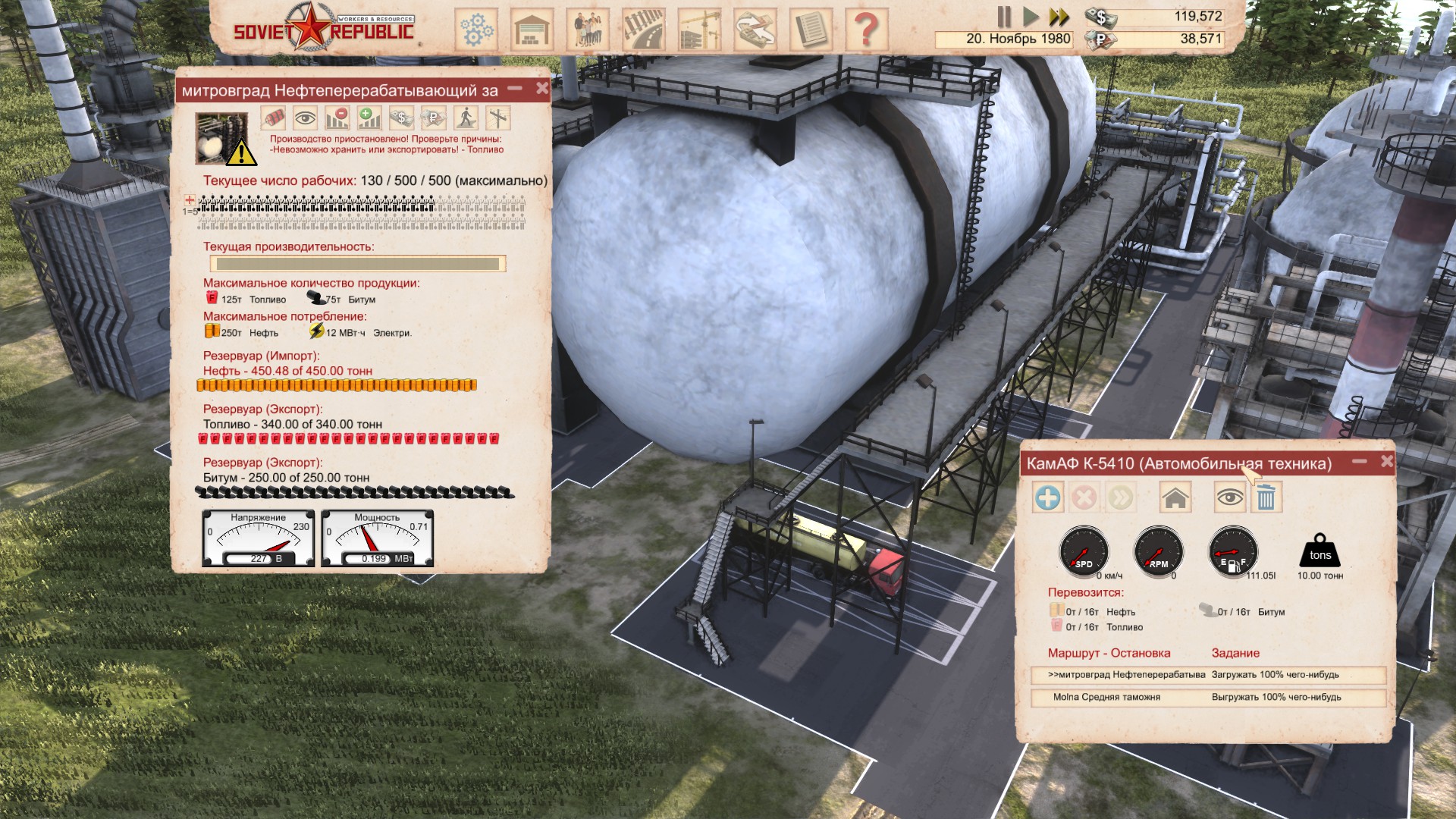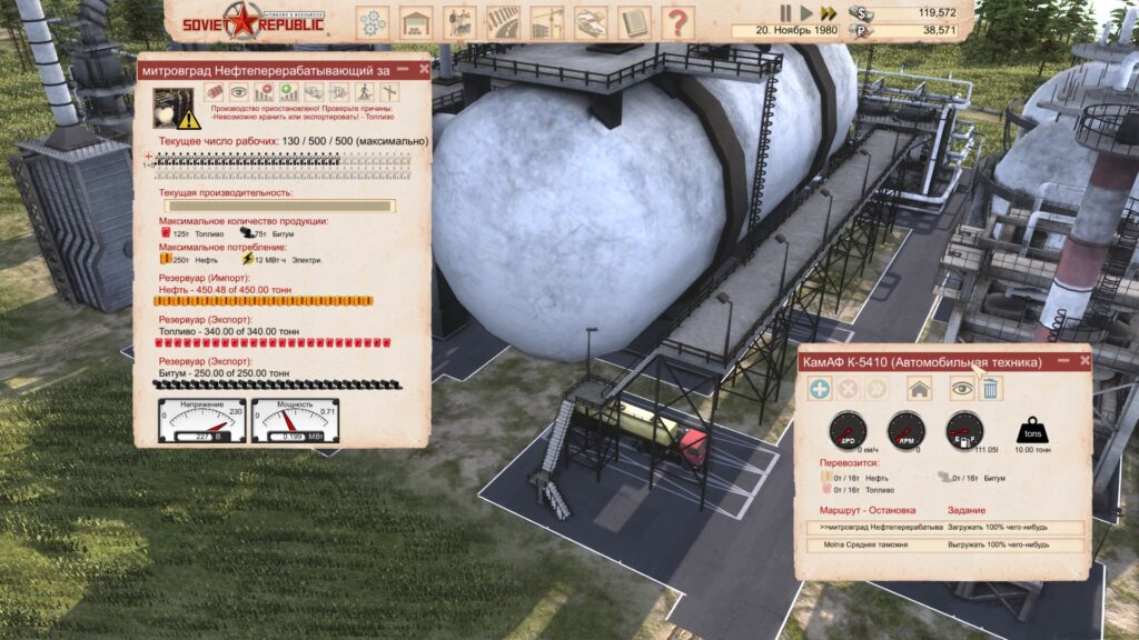 И конечно же, нельзя не упомянуть в данном пункте про систему энергетики которая затронула и транспорт – его необходимо периодически заправлять. Для заправки вам доступны, как это ни странно, заправочные станции, которые также можно будет обеспечить собственным топливом либо закупить за границей. Без топлива, конечно, ваш транспорт не встанет, но двигаться будет с черепашьей скоростью и только до ближайшей заправки.