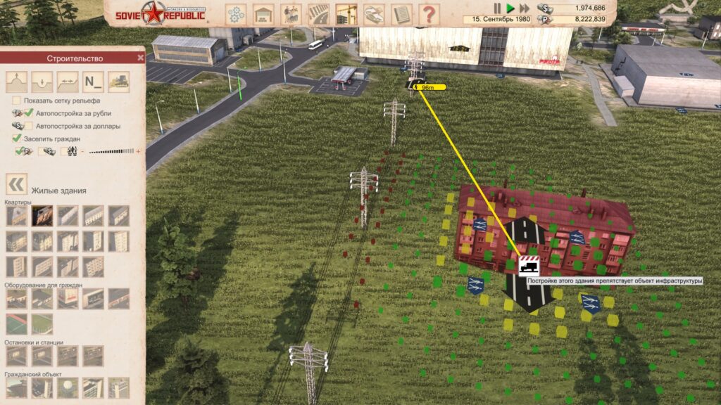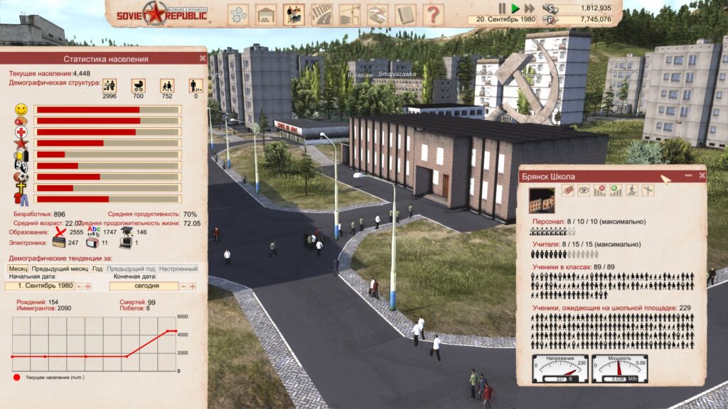 Пришло время поговорить про жителей, у которых имеется немало потребностей, среди которых: еда, жильё, электроэнергия, различные товары, а также доступ к сферам досуга, медицине и религии. Про последнюю кстати могу сказать, что возможность постройки церквей отсутствует, так как Советский Союз не приветствует религию. Однако если играть на карте с заранее построенными городами, то там есть церкви и прочие религиозные постройки, которые будут давать удовлетворённость этого параметра. А вот начав на пустой карте, восполнить потребность в религии просто нельзя и придётся чем-то заменять.