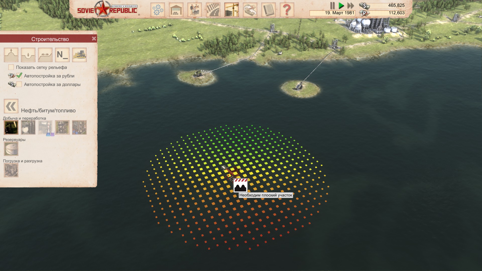В чем же заключаются местные особенности строительства? В игре есть 2 валюты – это рубли и доллары, за которые можно без лишних заморочек построить всё что угодно. Просто ставите галочку, к примеру, строить за рубли, и размещаете постройку – она сразу начинает строится и в процессе постройки из бюджета уходит сумма, пропорциональная тому, насколько завершен процесс постройки. Но когда кончаются деньги, то на помощь приходит местная система строительства за ресурсы. Конечно к этому моменту у вас уже должно быть какое никакое производство, и налаженная система экспорта, так как при малом бюджете вряд ли получится построить всё что доступно в игре.