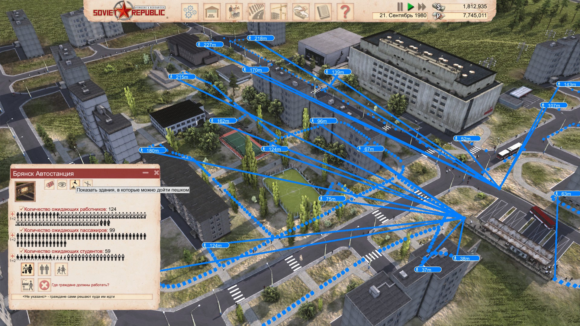 Но вернёмся к теме населения. У каждой постройки можно посмотреть зону пешей доступности, что является важной вещью, потому как надо грамотно планировать постройку города, чтобы жильцы могли добраться пешком от дома до детского сада, магазина, работы и т.д. Если какой-то объект интереса для жильцов расположен слишком далеко, то тут на помощь придут автостанции и курсирующие между ними автобусы. При желании наладить маршрут можно непосредственно между зданиями, так как каждое имеет возможный выезд на дорогу.