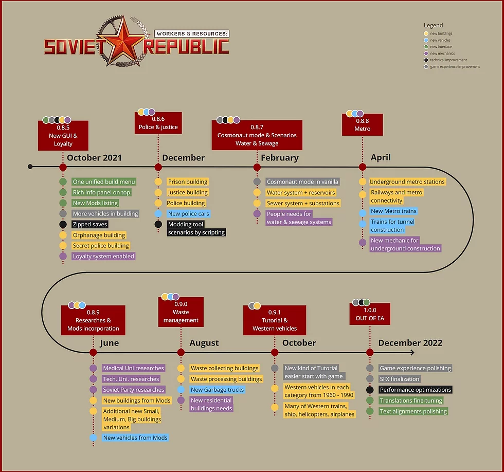 Приветствую вас, дорогие камрады из Советской Республики. Мы снова пришли с докладом о текущем положении дел с разработкой. Иногда вы не видите прогресса и всё это выглядит так, как будто мы плетёмся небольшими шагами, но эти небольшие шаги – путь к цели нашего путешествия, отличной игре, которую мы все любим. Кроме обычных фиксов и исправлений, на протяжении последних двух недель мы уделили больше внимания видению того, какой должна быть игра на релизе. Мы разработали план и теперь у нас есть чёткая дорожная карта с конкретными дедлайнами, а также конечной целью в конце 2022 года – к этому времени мы ходим, чтобы игра была готова для широкой публики. Это будет долгое путешествие, ведь нам придётся усердно поработать, так как мы хотим выпустить несколько контентных обновлений, добавить новые механики и другие новые вещи (некоторые из которых вы просили). И мы думаем, что справимся и сделаем эту игру одной из лучших в своём жанре.