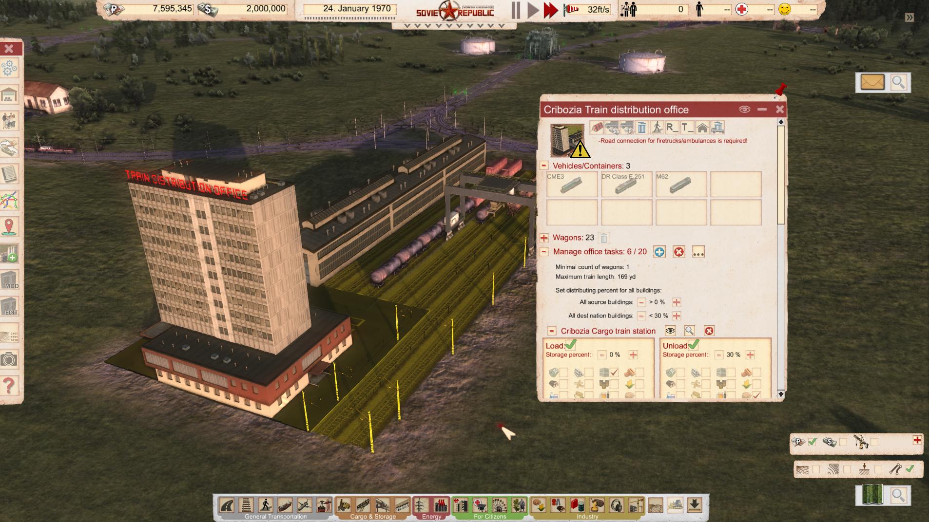 Итак, как же данное здание должно работать? Вы соединяете его со своей системой железнодорожных путей, завозите туда или покупаете несколько локомотивов и вагонов, которые могут быть различных видов. Затем вы устанавливаете источники ресурсов и места выгрузки с соответствующими процентными соотношениями (также, как и на автобазах), и железнодорожная база начнёт собирать поезда, добавляя вагоны к локомотивам, а затем посылать их в путешествие по заданным критериям. Мы знаем, что это звучит впечатляюще, но не забывайте, что вам придётся должным образом выстроить железнодорожную есть, чтобы поезда смогли перемещаться по своим маршрутам, поскольку вы не сможете добавить путевые точки и запретить поездам двигаться по нежелательным локациям.