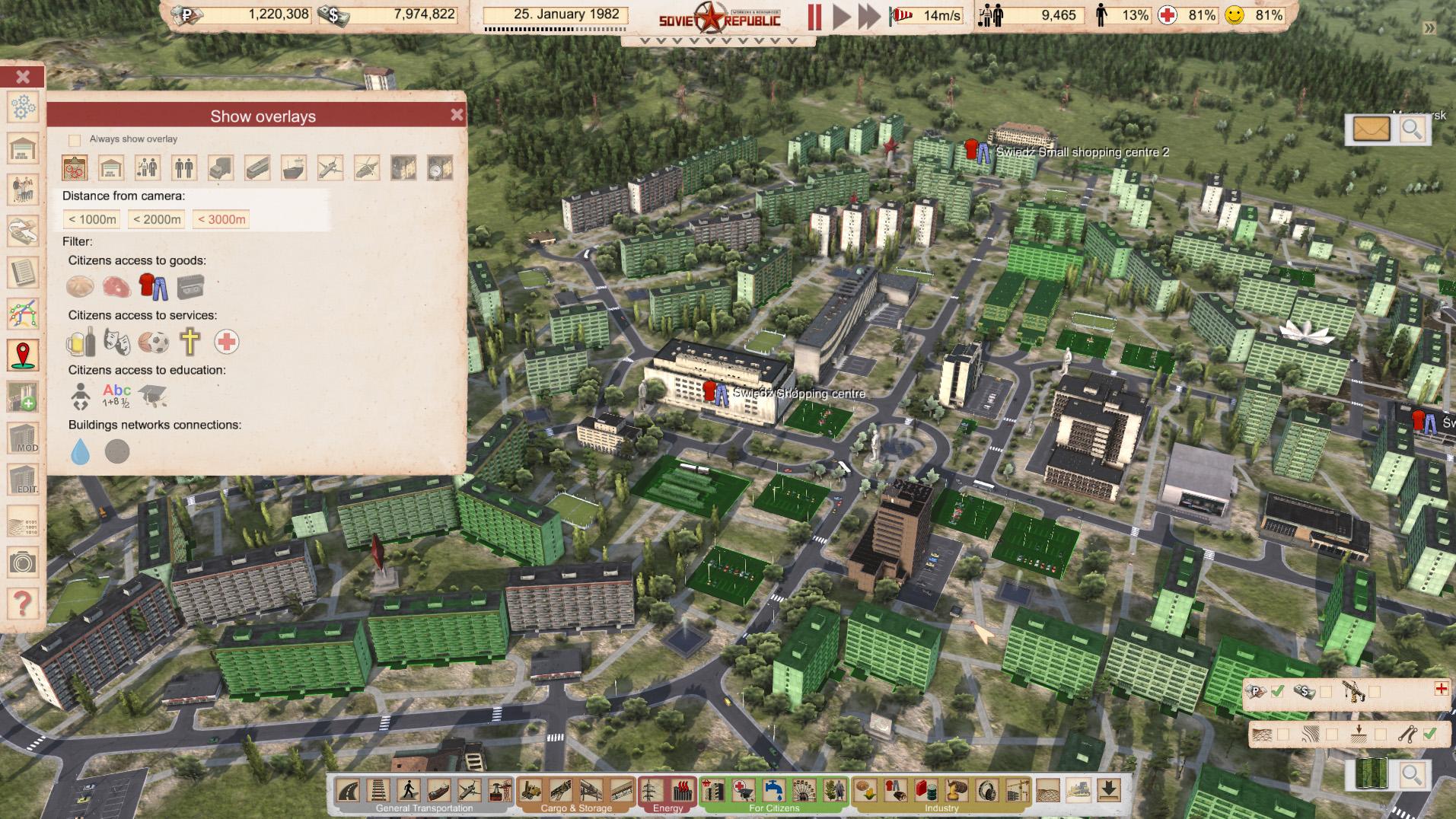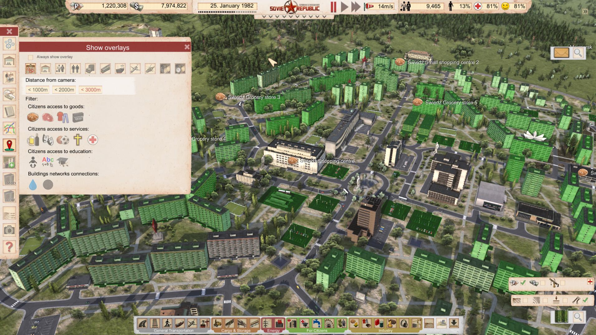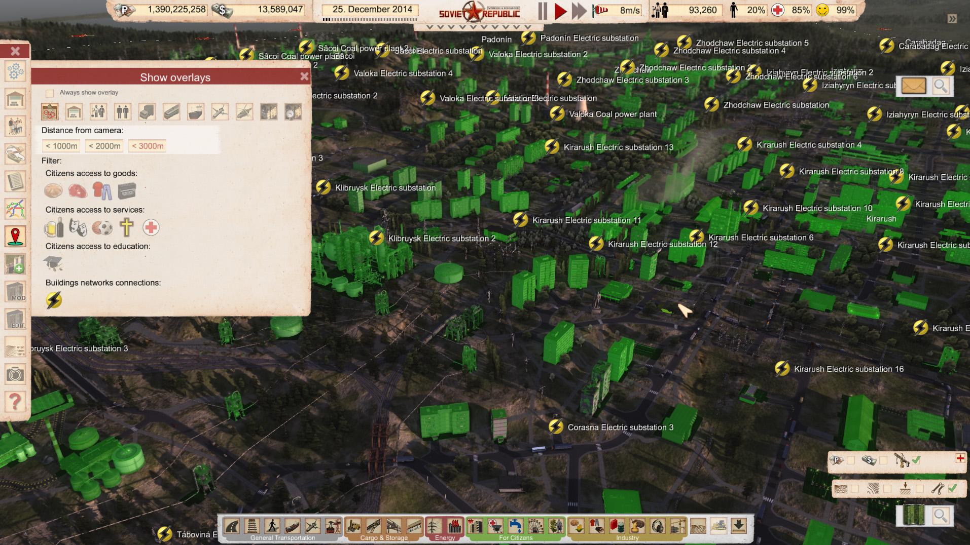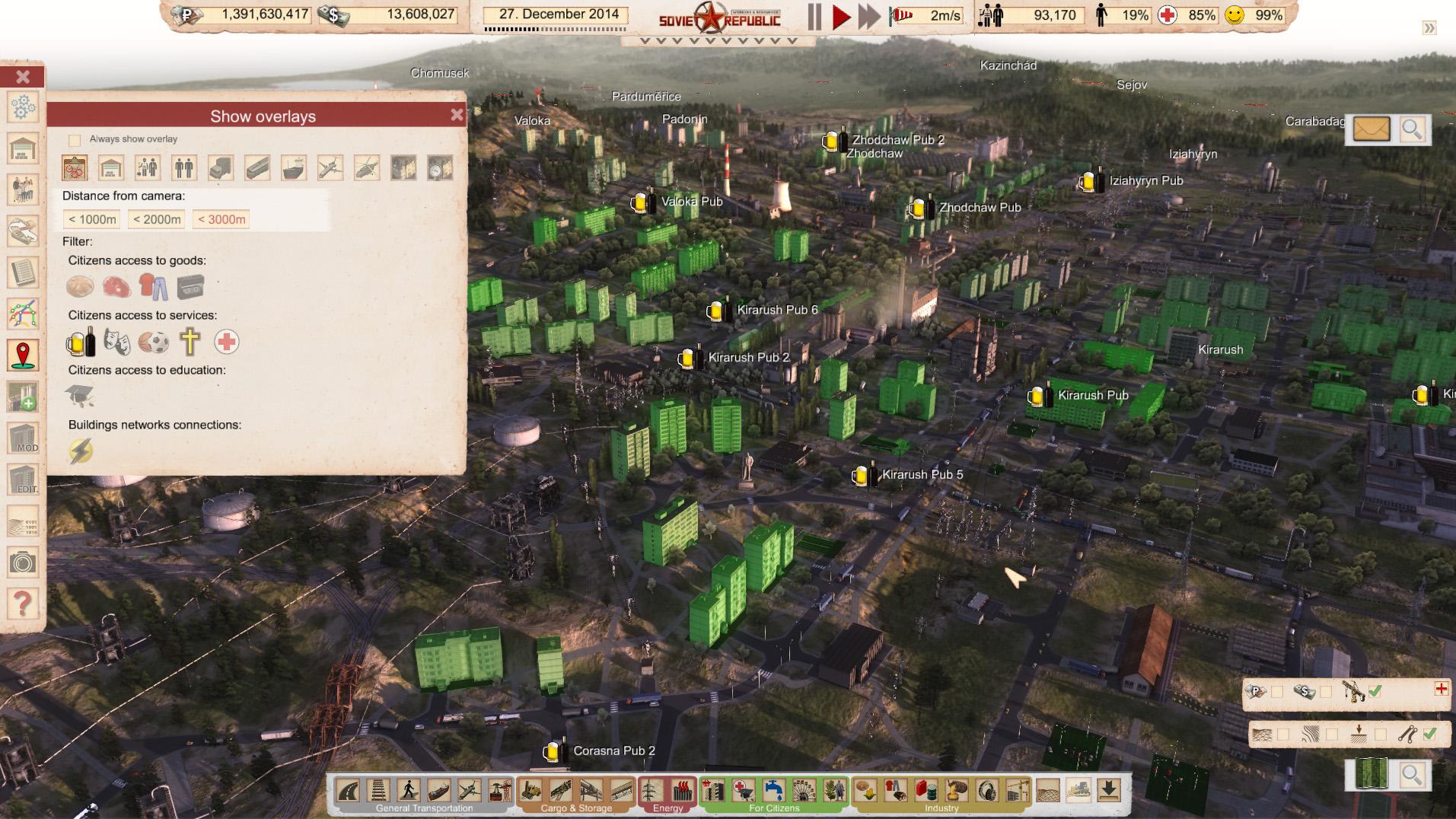 Именно поэтому мы вводим новую панель Городское Планирование. Она будет доступна в виде оверлеев и станет полезной при планировании жилых зон. Благодаря этому инструменту вы сможете посмотреть, как обстоят дела с объектами, обеспечивающими удовлетворение потребностей ваших граждан. Вы сможете посмотреть доступность различных товаров, образования и подключение к различным сетям, таким как электричество, водоснабжение и канализация.