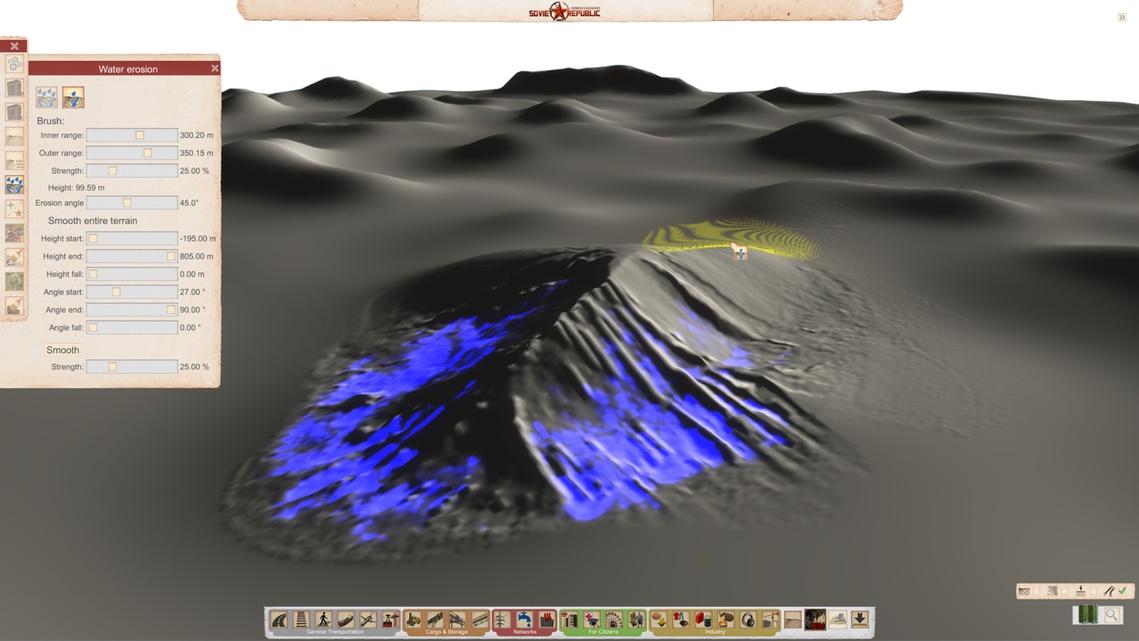 Температура в центральной Европе постепенно поднимается, и вскоре тут будут дожди с грозами, которые прольют тонну воды на землю. Почему мы упомянули это? Потому что мы хотим ввести ещё одну новую вещь, которая относится к течению воды и эрозиям. Мы думали о том, чтобы сделать ландшафт более реалистичным, и создали новый инструмент для редактора, который будет изменять случайно сгенерированный рельеф на что-то более реалистичное. Он также может использоваться для того, чтобы сделать импортированные карты более сглаженными.