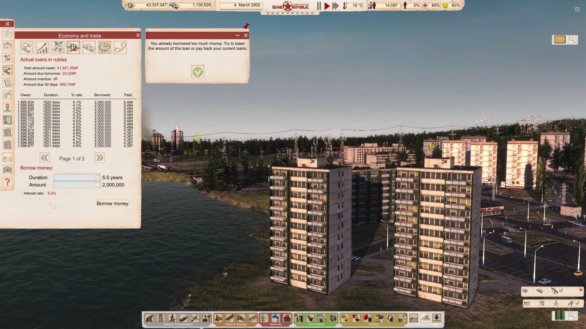 Одно из недавних изменений, которое мы сделали – это верхний предел для взятия займа, который зависит от населения и позволяет избежать эксплойта механики займов игрокам. Больше не будет возможности брать технически бесконечные займы и никогда не выплачивать их обратно, что окажется особенно полезным в реалистичном режиме – но мы планируем сделать это и в остальных. Формула возьмёт в учёт количество работников, которые у вас есть, и текущую стоимость иностранной рабочей силы, так что она будет успешно масштабироваться в зависимости от инфляции. Она также учитывает количество текущих займов в другой валюте, поэтому доступный лимит для другой валюты будет снижаться до тех пор пока займы не будут выплачены. Мы сделали небольшой тест, который показал, что вы сможете взять в долг сумму размером более 100% вашего ВВП, если вы используете все доступные займы, так что попасть в ловушку долгов всё ещё возможно. Однако вы не сможете откупиться, просто беря всё больше и больше займов чтобы оплачивать ими всё больше и больше долгов. Взятие и не погашение займов в одной из валют вам тоже не поможет.