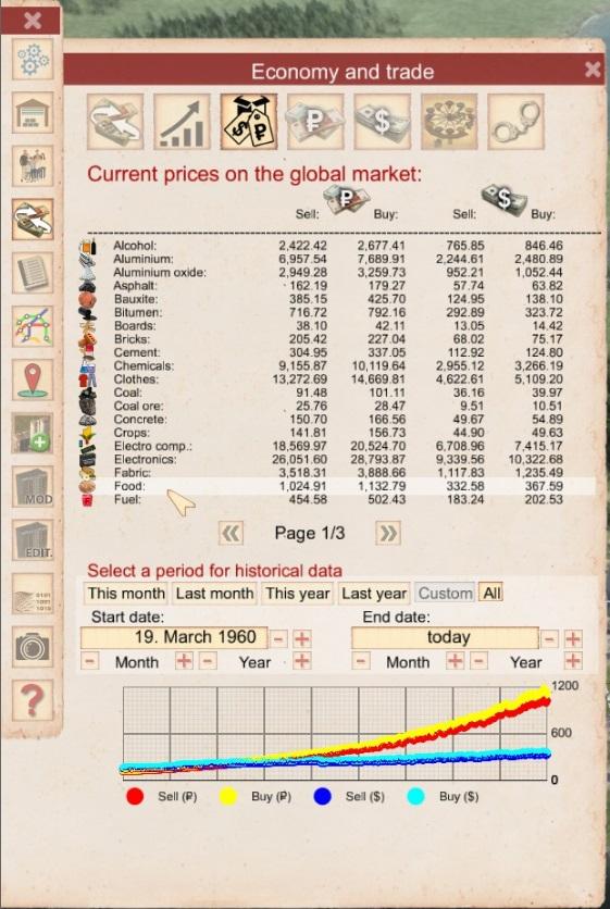 Затем, мы хотели бы поделиться с вами важной информацией из-за кулис о том, как в игре изменяются цены, поскольку данная механика уникальна и делает каждую республику, в которой вы играете, отличной от всех других. На данный момент есть формула, которая подсчитывает общую инфляцию для ресурсов и добавляет небольшие случайные отклонения для каждого из них. Затем, есть глобальные события, которые могут добавить дополнительные изменения цен, длящиеся неделями или месяцами. Есть два типа ресурсов. Базовые ресурсы имеют фиксированную стартовую цену, которая генерируется в начале каждой игры – это «сырые» ресурсы (дерево, зерно, гравий, боксит, уголь, железо, урановая руда и нефть). Все другие ресурсы производятся из них с помощью комбинации рабочей силы и одного из ресурсов, что означает, что цены на все производимые ресурсы зависят от базовых. Например, цена на нефть в определённой степени влияет на цену на топливо и битум. На все вышеперечисленные изменения игрок влиять не может.