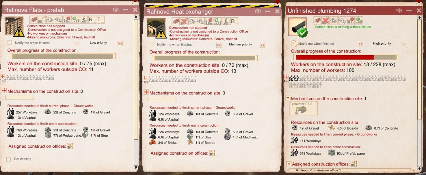 Но позвольте начать с того, что нового в игре сейчас. Во-первых, хотим упомянуть, что мы добавили приоритеты для строек. Что это значит? До этого все стройки имели одинаковый приоритет и строительные конторы работали с ними в порядке «что первое появилось, туда и едем». Это означало, что ранее начатые стройки всегда были в приоритете, и часто это вызывало проблемы, поскольку вместо како-то здания вам нужно было построить другое, но строительные конторы не отправляли туда рабочих, пока вы не поставите предыдущую стройку на паузу. Теперь же каждая стройка будет иметь опцию в окне настроек, которая позволит изменить приоритет между тремя уровнями (низкий, средний, высокий). По умолчанию будет установлен низкий приоритет везде, и вы сможете повысить его на любой из строек в зависимости от ваших нужд. Это будет особенно полезно при массовой застройке для тех игроков, которые используют автопоиск в строительных конторах. Вам нужно в первую очередь построить конкретную дорогу? Или провода среднего напряжения вместе с подстанцией? Просто повысьте их приоритет и строительные конторы отправят туда рабочих в первую очередь.