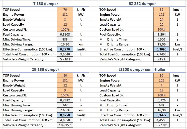 Мы знаем, что это довольно большой объём информации, и мы не можем раскрыть все детали. Наиболее значимая информация для вас заключается в том, что транспорт имеет такой же расход топлива, как и раньше, но при этом он не будет увеличиваться, если заставить транспорт ехать медленнее чем он может. Ещё одна важная вещь вещь – это максимальная дальность, и она должна по-прежнему остаться чуть выше 15 км на один бензобак для небольших грузовиков и значительно более 20 км для ваших локомотивов. Мы также подготовили калькулятор потребления топлива, который поможет вам сравнить различные автомобили, чтобы решить, какой выбор будет наиболее экономичным для ваших транспортных нужд. Не всегда чем больше, тем лучше, поскольку вам придётся учитывать, сколько топлива потребляет транспортное средство с определённой загрузкой на определённой дистанции, таким образом в таблице вы можете использовать «Effective Consumption (100 km)» как меру для сравнения различного транспорта. С помощью этого можно узнать, как много топлива транспорт будет потреблять за каждую перевозимую тонну. Затем, «Total Fuel Consumption (100 km)» покажет, какое количество топлива транспортное средство использует, чтобы преодолеть 100 км со своим грузом. Можно легко пересчитать эти числа для различных параметров и дистанций по вашему желанию. Основное правило – чем меньше, тем лучше. Вот ссылка на калькулятор: https://onedrive.live.com/view.aspx?resid=46E10797B235EEA!34285&ithint=file%2cxlsx&authkey=!AGoOozDwfgaJCIc
